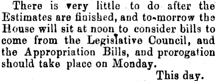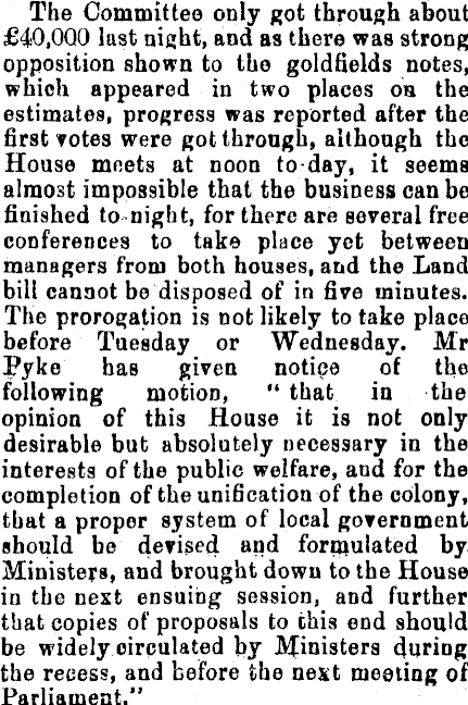 The Committee only got through about £40,000 last night, and as there was strong opposition shown to the goldfields notes, which appeared in two places on the estimates, progress was reported after the first votes were got through, although the House meets at noon to day, it seems almost impossible that the business can be finished to night, for there are several free conferences to take place yet between managers from both houses, and the Land bill cannot be disposed of in five minutes. The prorogation is not likely to take place before Tuesday or Wednesday. Mr Pyke has given notice of the. following motion, " that in the opinion of this House it is not only desirable but absolutely necessary in the interests of the public welfare, and for the completion of the unification of the colony, that a proper system of local government should be devised and formulated by Ministers, and brought down to the House in the next ensuing session, and further that copies of proposals to this end should be widely circulated by Ministers during the recess, and before the nest meeting of Parliament."
