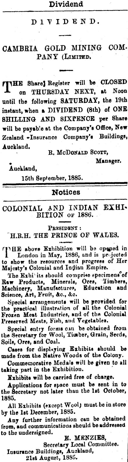 Dividend DIVIDEND. CAMBRIA. GOLD MINING COMPANY (Limited. THE Share] Register -will be CLOSED on THURSDAY NEXT, at Noon until the following SATURDAY, the 19th instant, when a DIVIDEND (Bth) of ONE SHILLING AND SIXPENCE per Bhare will be payable at the Company's Office, New Zealand -Insurance Company's Buildings, Auckland. R. McDonald Scott, . Manager. Auckland, 15th September, 1885. Notices COLONIAL AND INDIAN EXHIBITION of 1886. Pbksidbnt : H.R.H. THE PRINCE OF WALES. rpHE above Exhibition will ba opqped in 1 London in May, 1886, and is projected to show the resources and progress of Her Majesty's Colonial and Indian Empire. The Exhi its should comprise specimens of Raw Products, Minerals, Ores, limbers, Machinery, Manufactures Education and Science, Art, Fruit, Ac, &o. Speoial arrangements will be provided for the practical illustration of all the Colonial Frozen Meat Industries, aud of th« Colonial Preserred Meats, Fish, ami Vegetables. Special entry forms can be obtained from the Secretary for Wool, Timber, Grain, Seeds, Soils, Ores, and Coal. Cases for displaying Exhibits should be made from the Nature Woods of the Colony. Commemorative Medals will be given to all taking part in the Exhibition. Exhibits will be carried free of charge. Applications for space must be sent in to the Secretary not later than the Ist October, 1885. All Exhibits (except Woolj must be in store by the Ist December, 1885. Any farther information can be obtained from, and communications should be addressed to the undersigned. K. MENZIES, Secretary Local Committee. Insurance Buildings, Auokland, 21st August, 1885.