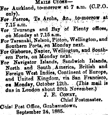 Maim Cross— For Auckland, to-morrow at 7 a.m. (C.P.O. only). For Paeroa, Te Aroha, *c., to-morrow at 7.15 a.m.' ', Wor Tauranga and Bay of Plenty offices, on Monday at 7.16 a.m. . For Taranaki, Nelson, Pi6ton, "Wellington, and Southern Ports,>n Monday next. For Gisborne, papier, Wellington, and Southern Ports, on Monday next. For Navigator Islands, Sandwich Islands, North »n& South America, British and Foreign West Indies, Continent of Europe, and United Kingdom, via San Francisco, «■ Monday, October 12th. (This mail is due in London about 20th November.) J. E. Cokby, Chief Postmaster. Okie' Post Office, GrahfTHstown, September 24,1885.