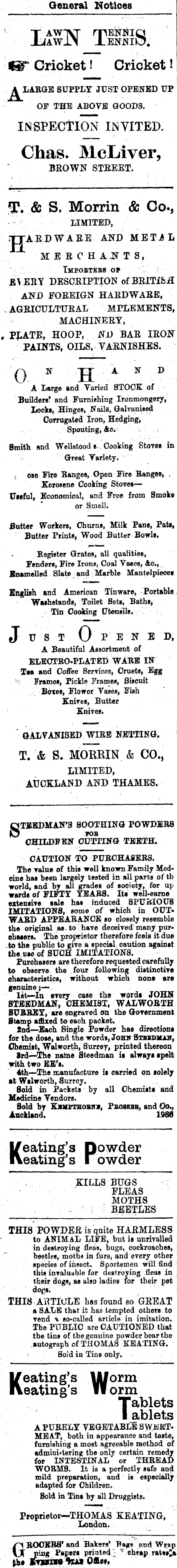 General Notices IyAWiA XENNI&. Cricket! A LARGE SUPPLY JUST OPENED UP OF THE ABOVE GOODS. INSPECTION IMYITED. Chas. MeLiver, BROWN STREET. *T. & S. Mprrin & Co., LIMITED, TTARDWARE AND METAL MERC H A.N T S, Tmpoetbbs o* ' : fitERY DESCRIPTION of BRITISH AND FOREIGN HARDWARE, v AGRICULTURAL MPLEMENTS, MACHINERY, , PLATE, HOOP, ND BAR IRON PAINTS, OILS, VASNISHES. 0. N H ■:> * D '■'■■ A Large and Varied STOCK of Builders? and Furnishing Ironmongery, Locks, Hinges, Nails, Galvanised Corrugated Iron, Hedging, .... Spouting, 4o< ?. ■:.. Smith »nd Wellstood s . Oooking Stoves in Great Variety. : oaa Fire Ranges, Open Fire Ranges, . Kerosene Oooking Stoves— Useful, Economical, and Free from Smoke or Smell. Butter Workers, Churns, Milk Pans, Pata, Butter Prints, Wood Butter Bowls. - Register Grateß, all qualities, Fenders, Fire Irons, Coal Vases, &c,. Enamelled Slate and Marble Mantelpieces English and American Tinware, Portable, Withstands, Toilet Sets, Baths, Tin Cooking Utensils. Jv st Open cd, A Beautiful Assortment of ELECTRO-PLAT ED WA&E IN Im and CoSee Services, Cruets, Egg Frames, Pickle Frames, Biscuit Boxes, Flower Vases, Fish Knives, Butter Knives. ' GALVANISED WIEB NETTING. T. & S. MORRIN & CO., LIMITED, AUCKLAND AND THAMES. STBEDMAN'S SOOTHING POWDHRB JOB OHILDFEN CUTTING TEETH. CAUTION TO PURCHASERS. The value of this well known Family Medcine has been largely tested in all parts of tb world, and by all grades of society, for up wards of FIFTY YEARS. Its well-earne extensive sale has induced SPUMOUS IMITATIONS, some of which in OUTWARD APPEARANCE so closely resemble the original as to have deceived' many purchasers. The proprietor therefore feels it due .to the public to give a special caution against theuse of SUCH IMITATIONS. Purchasers are therefore requested carefully to observe, the four following distinctive characteristics, without which none are genuine j—. Ist—ln every case the words JOHN STEKDMAN, CHEMIST, WALWORTH BUBREY, are engraved on the Government Stamp affixed to each packet. 2nd—Each Single Powder has directions for the dose, and the words, John Stbbsxav, Chemist, Walworth, Surrey, printed thereon Brd—The name Steedman is always spelt with two EE's. 4th—The manufacture is oarried on solely •t W«lworth, Surrey. Sold in Packets by all Chemists and Medicine Vendors. Sold by KvoTHOBJU, Pbosbbb, and Op., Auckland. 1988 Keating' s Howder eating's r bwder KILLS BUGS FLEAS MOTHS i BEETLES THIS POWDER is quite HARMLESS to ANIMAL LIFE, but is unrivalled in destroying fleda, bugs, cockroaches, beetles, motha in furs, and every other species of insect. Sportsmen will find this invaluable for destroying fleas in their dogs, as also ladies for their pet dogs. THIS AttTIULE has found so GREAT a SALE that it has tempted others to vend a so-called article in imitation. The PUBLIC are CAUTIONED that the tins of the genuine powder bear the autograph of THOMAS KEATING. Soid in Tins only. K eating's lilorm eating's llorm Tablets ablets A PURELY VEGETABLE SWEETMEAT, both in appearance and taste, furnishing a most agreeable method of administering the only certain remedy for INTESTINAL or THREAD WORMS. It is a perfectly safe and mild preparation, and is especially adapted for Children. Sold in Tins by all Druggists. Proprietor—THOMAS KEATING, London. /■^ROGERS' and Bakers' Bags and Wrap VJ jpingPapeM printed." v% cheap »(•»*• jh# STjorare *u» Ofiei.