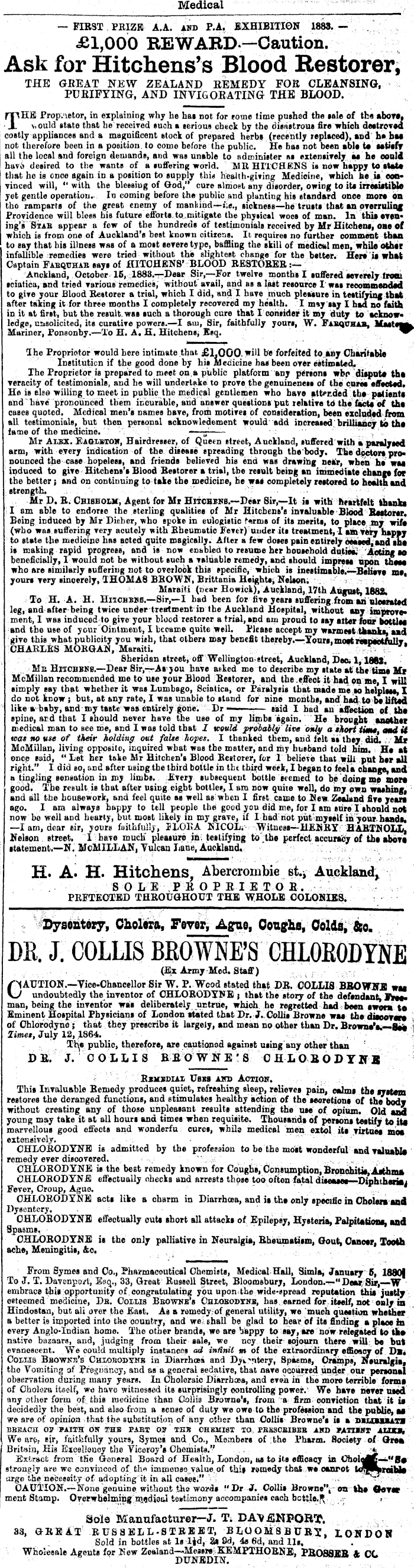 1 Medical — FIRST PRIZE A.A. akd P.A. EXHIBITION 1888.— £1,000 REWABD—Caution. Ask for Hitchens's Blood Restorer, THE GREAT NEW ZEALAND! REMEDY FOE CLEANSING, PURIFYING, AND INVIGORATING THE BLOOD. THE Proprietor, in explaining why he hat not for some time pushed the tale of th« abore, v.ould state that he received such a serious check by the disastrous fire which destroyed costly appliances and a magnificent stock of prepared herbs (recently replaced), and h* bet not therefore been in a position, to come before the public. He has not been able to satisfy all the local and foreign demands, and was unable to ndminister its eztensirely m he could havi desired to the wants of a suffering world. MR HITCHENS ia now happy to state that he is once again in a position to supply thia health-giving Medicine, which fee it convinced will, " with the blessing of God," cure almost any disorder, owing to its irresistible yet gentle operation.- In coming before the public and planting his standard once more on tho ramparts of the great enemy of mankind—i.e., sickness—he trusts that an overruling Providence will bless hia future efforts,to mitigate the physical woes of man. In this evening's Stab appear a few of the hundreds of testimonials received by Mr Hitohens, oae of which is from one of Auckland's best known citizens. It requires no further comment than to say that his illness was of a most severe typo, baffling the skill of medical men, while othtr infallible remedies were tried without the slightest change for the better. Her* is what Captain Fabqtjhab says of fIITOHENB' BLOOD RESTORER :— Anckland, October 15, 1883.—Dear Sir,—For twelve months I suffered severely from sciatica, and tried various remedies," without' avail, and as a last resource I' was reoommendad to give your Blood Restorer a trial, which I did, and I have much pleasure in testifying thifc after taking it for three months I completely recovered my health. I may say I had no faith in it at first, but the reßult.was such a thorough cure that I consider it my duty to acknowledge, unsolicited, its curative powers.—l am, Sir, faithfully yours, W. Fasqxthab, Mattel^ Mariner, Foneonby.—To H. A. K. Hitchene, Esq. Ihe Proprietor would here intimate that £1,000. !"i'l be forfeited to any Charitable Institution if the good done by his Medicine has been over estimated. The Proprietor is prepared to meet on a public platform any persons wbo dispuU the Teracity of testimonials, and he will undertake to prove the genuineness of the cures effected. He is else willing to meet in public the medical gentlemen who have attrded the patient* and have pronounced them incurable, and answer questions put relative td the facts of the cases quoted. Medical men's names have, from motives of consideration, been excluded from all testimonials, but then personal acknowledgment would' add increased' brilliancy to the fame of the medicine. " : . — j —— Mr ALBX. Eaklbtoh, Hairdresser, of Queen street, Auckland, suffered*with •> paralysed arm, with every indication of the/disease spreading through the body. The doctors pro* : nounced the case hopeless, and friends believed his end was drawing near, when he was induced to give Hitchens's Blood Bestorer a trial, the result being an immediate change for the better; and on continuing to take the medicine, he was completely restored to health and strength. ...,:.•; ,': ■. ■ -■, ■■-.■•'":.'■ ; ■■''? Mr D. R. Ceisholm, Agent for Mr Hitchbnb.—Dear Sir,—lt is with heartfelt thanks : I am able to endorse the sterling qualities of Mr Hitcbens's invaluable Blood Bestorer. Being induced by Mr Dicber, who spoke in eulogistic tartns of its merits, to place my wife (wbo was. suffering very acutely with Rheumatic Fever) uuder its treatment, I am very happy to Btate the medicine has acted quite magically. After a few doses pain entirely ceased, and she is making rapid progress, and is now enabled to resume her household duties. Acting so beneficially, I would not be without such a valuable remedy, and should impress upon these who are similarly suffering not to overlook this specific, which is inestimable.—Believe me. yours very sincerely, THOMAS BROWN, Brittania Heights, Nelson. Maraiii (near Ho wick), Auckland, 17th August, 1888. To H. A. H. Hiicbbbb.—Sir,—l bad been for five years suffering from an ulcerated leg, and after'being twice under treatment in the Auckland Hospital, without any improve* ment, I was induced to give your blood restorer a trial, and am proud to say alter four bottles and the use of your Ointment, I became quite well. Please accept my warmest .thanks, and give this what publicity you with, that others may benefit thereby.—Yours, most retDeetfullT CHARLES MORGAN, Maraiti. ; ; *^ ** Sheridan street, off Wellington-street, Auckland, Deo. 1,1862. Me HrrCHßNS.—Dear Sir,—As you have asked me to describe my state at the time Mr McMillan recommended.me to uee your Blood Bestorer, and. the .effect it had on me, I will simply say that whether it was Lumbago, Sciatica, or Paralysis that made me so helpless, X do not know; but, at any rate, I was unable to stand for nine months, and had-to be lilted 1 like a baby, and my taete was entirely gone. Dr——— said I had au affection of tho Bpine, ard that I should never have the use of my limbs again. He brought another medical man to see me, and I was told that I would probably' live only a short time, tmd U teas no use of their holding out false hopes. I thanked them, and felt as they did. Mr i McMillan, living opposite, inquired what was the matter, and my husband told him. Heat once said, "Let her take Mr Hitchen's Blood Restorer, for 1 believe that wili put her all right." I did so, and after using the third bottle in the third week, I began to feel a change, and a tingling sensation in roj limbs. Every subsequent bottle seemed to be doing me more good. The result is that after using eight bottl