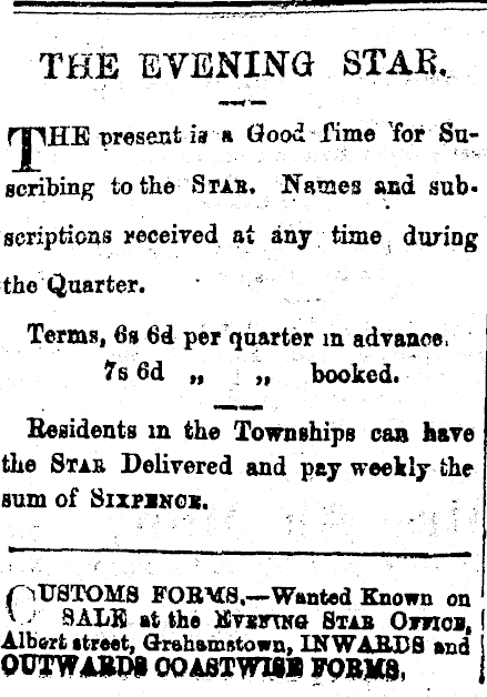 THE EVENING STAE V i fTIHE present ia » Good fime 'for -ABcribing to the Stab. Name 3 and subscriptions yeceived at any time, during the Quarter. ■ ; Terms, 6a 6d per quarter m advance, 7s 6d „ : „ booked. Residents m the Townships can bare the Stab Delivered and pay weekly the sum of Sixpinob. pUSTOMS FOBM:s.—Wanted Known on * -■'■■ SAIjB at the Kvsmwa Stab Omoi, I Albwt itreet, Grahamstown, IKWABJDS and OUTWABMOOASTWIMFQBM3, j