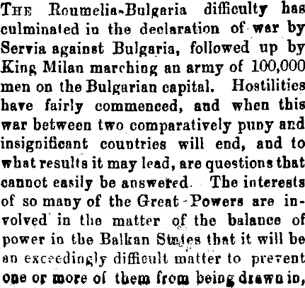 The Roumelia-Bulgaria difficulty has culminated in the declaration of war by Servia against Bulgaria, followed up by King Milan marching an army of 100,000 men on the Bulgarian capital. Hostilities hare fairly commenced, and when this war between two comparatively pimy and insignificant countries will end, and to what results it may lead, are questions that cannot easily be answered The interests of so many of the Great-Powers are involved in the matter qf the balance of power in the Balkan Steves that it will be an exc?ediri£ly difficult matter to prevent one or more of them from being duwa id,