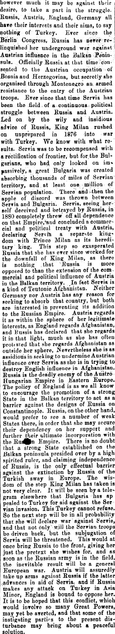 however much it may be against th<ur i desire, to take a part in the struggle. Russia, Austria, England, Germany all hare their interests and their aims, to say nothing of Turkey, Ever 6i«ca the Berlin Congress, Eussia has never relinquished her underground war ogainst Austrian influence in the Balkan Peninsula. Officially Russia at that time consented to the Austrian occupation of Bosnia and Herzegovina, but secretly she organised through Montenegro an armed resistance to the entry of the Austrian troops. Ever since that time Servia has been the field of a continuous political struggle between Russia and Austria. Led on by the wily and insidious advice of Russia, King Milan rushed on unprepared in 1876 into war with Turkey. We know with what results. Servia was to be recompensed with a rectification of frontier* but for,the Bulgarians, who had only looked on mo» passively, a great Bulgaria was created absorbing thousands of miles of Servian territory, and at least ope million of Servian population. There and^then the apple of discord was thrown between Servia and Bulgaria. Servia, seeing her- ! self deceived and betrayed by Russia, in 1880 completely threw off all dependence on that Empire,<and concluded a commercial and political treaty with Austria, declaring Serua a separate king* dom with Prince Milan as its hereditary king. This step so exasperated Russia that she has ever since worked for the downfall of King Milan, as there is nothing that "Eussia is more opposed to than the extension of the commercial and political influence of Austria in the Balkan territory. In fact Servia is a kind of Teutonic Afghanistan. Neither Germany nor Austria has any reason for seeking to absorb that country, but both are interested in preventing its addition to the Russian Empire. Austria regards it as within the sphere of her legitimate interests, as England regards Afghanistan, and Bussia has declared that she regards it in that light, much as she has often protested that she regards Afghanistan as outside her sphere, Nevertheless she is as assidious in seeking to undermine Austrian influence over Servia as she is in trying to destroy English influence in Afghanistan. Russia is the deadly enemy of the Austro Hungarian Empire in Eastern Europe. The policy of England is as we all know to encourage the promotion of a strong State in the Balkan territory to act as a barrier against the designs of Russia en Constantinople. Russia, on the other hand, would prefer to see a number of weak States there, in order that she may secure their dependency on her support and further their ultimate incorporation with the Rusffcn Empire. There is no doubt that a strong State established on the Balkan peninsula presided over by a high spirited ruler, and claiming independence of Russia, is the only effectual barrier against the extinction by Russia of the Turkish sway in Europe. The wisdom of the step King Milan has taken is not very clear. It will be seen by a tele» gram elsewhere that Bulgaria has ap pealed to Turkey for aid against the Ser vian invasion. This Turkey cannot refuse. So the next step will be in all probability that she will declare war against Servia, and that not only will the Servian troops be driven back, but the subjugation of Servia will be threatened. This would at once bring Russia to the front, giving her just the pretext she wishes for, and as soon as the Russian army is in the field, the inevitable result will be a general European war. Austria will assuredly take up arms against Russia if the latter in aid of Servia, and if Russia makes any attack on Turkey in Asia Minor, England is bound to oppose her. It is to be hoped that this conflict, which would involve so many Great Powers, may yet be averted, and that some of the instigating parties to the present disturbance may bring about a peaceful solution.