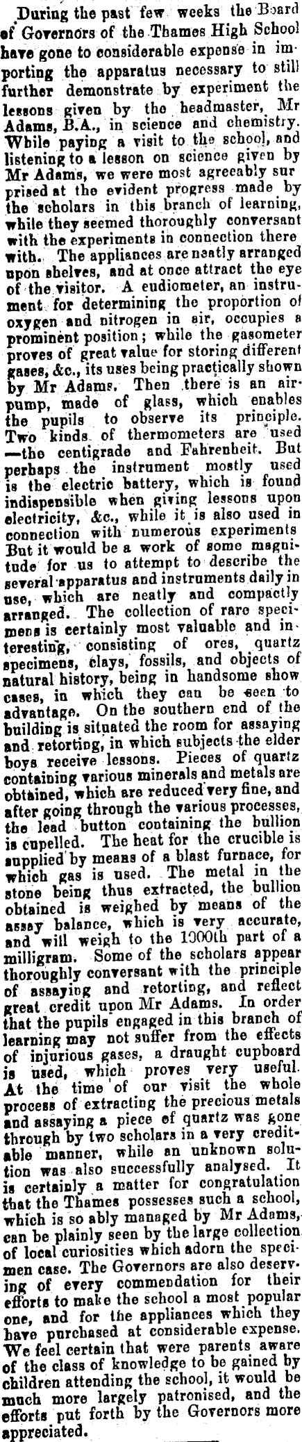 Daring the past few weeks the Board of Gorernors of the Thames High School hare gone to considerable expense in importing the apparatus necessary to still further demonstrate by experiment the lessons given by the headmaster, Mr Adams, 8.A., in : " science arid chemistry. "While paying a visit to the school, and listening to a lesson on science given by Mr Adams, we were most agreeably sur prised at the evident progress made by the scholars in this branch of learning, while they seemed thoroughly conversant with the experiments in connection there with. The appliances are neatly arranged opon shelves, and at once attract the eye of the visitor. A eudiometer, an instrument for determining the proportion of oxygen and nitrogen in air, occupies 8 prominent position; while the gasometer proves of great value for storing different gases, &c, its uses being practically shown by Mr Adams. Then there is an airpump, made of glass, which enables the pupils to observe its principle. Two kinds of thermometers are used —the centigrade and Fahrenheit. But perhaps the instrument mostly used is the electric battery, which is found indispensible when giving lessons upon electricity, &c, while it is also used in connection with numerous experiments But it would be a work of some magnitude for us to attempt to describe the several apparatus and instruments daily in use, which are neatly and compactly arranged. The collection of rare specimens is certainly most valuable and interesting, consisting of ores, quartz specimens, clays, fossils, and objects of natural history, being in handsome show cases, in which they can be -seen to advantage. On the southern end of the building is situated the room for assaying »nd retorting, in which subjects the elder boys receive lessons. Pieces of quartz containing various minerals and metals are obtained, which are reduced very fine, and after going through the various processes, the lead button containing the bullion is cupelled. The heat for the crucible is aupplied'by means of a blast furnace, for which gas is used. The metal in the stone being thus extracted, the bullion obtained is weighed by means of the assay balance, which is very accurate, and will weigh to the 1000 th part of a milligram* Some of the scholars appear thoroughly conversant with the principle of assayiog and retorting, and reflect great credit upon Mr Adams. In order that the pupils* engaged in this branch of learning may not suffer from the effects of injurious gases, a draught cupboard is used, which proves very useful. At the time'of our visit the whole process of extracting the precious metals and assaying a piece ©f quartz was gone through by two scholars in a very creditable manner, while an unknown solution was also successfully analysed. It is certainly a matter for congratulation that the Thames possesses such a school, which is so ably managed by Mr Adams, can be plainly seen by the large collection of local curiosities which adorn the specimen case. The Governors are also deserving of every commendation for their efforts to make the school a most popular one, and for the appliances which they have purchased at considerable expense. We feel certain that were parents aware of the class of knowledge to be gained by children attending the school, it would be much more largely patronised, and the efforts put forth by the Governors more appreciated.