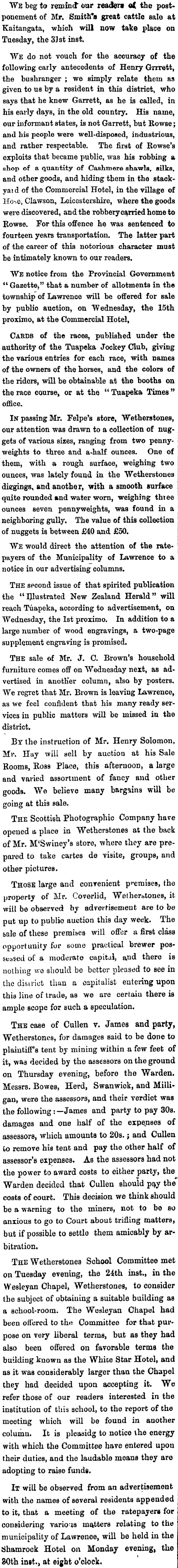 Wk beg to remind' 6u* reader* at the post* ponement of Mr. Smith's great cattle sale at Kaitangata, which will now take place on Tuesday, the 3Jst inst. "We do not vouch for the accuracy of the following early antecedents of Henry Grrrett, the bushranger ; we simply relate them as given to us by a resident in this district, who says that he knew Garret b, as he is called, in his early days, in the old country. His name, our informant states, is not Garrett, but Bowse ; and his people were well-disposed, industrious, and rather respectable. The first of Bowse's exploits that became public, was his robbing a shop of a quantity of Cashmere shawls, silica, and other goods, and hiding them in the stackyaid of the Commercial Hotel, in the village of Ho->e, Clawson, Leicestershire, where the goods were discovered, and the robberycarriedhometo Bowse. For this offence he was sentenced to fourteen years transportation. The latter part of the career of this notorious character must be intimately known to our readers. We notice from the Provincial Government I " Gazette," that a number of allotments in the i township of Lawrence will be offered for sale by publio auction, on Wednesday, the 15th proximo, at the Commercial Hotel, Cards of the races, published under the authority of the Tuapeka Jockey Club, giving the various entries for each race, with names of the owners of the horses, and the colors of the riders, will be obtainable at the booths on j the race course, or at the " Tuapeka Times " office. i I In passing Mr. Felpe's store, Wetherstones, our attention was drawn to a collection of nuggets of various sizes, ranging from two pennyweights to three and a-half ounces. One of them, with a rough surface, weighing two ounces, was lately found in the Wetherstones diggings, and another, with a smooth surface quite rounded and water worn, weighing thiee ounces seven pennyweights, was found in a neighboring gully. The value of this collection of nuggets is between £40 and £50. We would direct the attention of the ratepayers of the Municipality of Lawrence to a notice in our advertising columns. The second issue of that spirited publication the "Illustrated New Zealand Herald" will reach Tuapeka, according to advertisement, on Wednesday, the Ist proximo. In addition to a large number of wood engravings, a two-page supplement engraving is promised. The sale of Mr. J. C. Brown's household furniture comes off on Wednesday next, as ad- | vertised in another column, also by posters. We regret that Mr. Brown ia leaving Lawrence, as we feel confident that his many ready services in public matters will be missed in the district. By the instruction of Mr. Henry Solomon, Mr. Hay will sell by auction at his Sale Rooms, Eoss Place, this afternoon, a large and varied assortment of fancy and other goods. We believe many bargains will be going at this sale. The Scottish Photographic Company have opened a place in Wethcrstones at the back of Mr. M'Swiney's store, where they are prepared to take cartes de viaite, groups, and other pictures. Those large and convenient premises, the property of Mr. Coverlid, Wetheratones, it will be observed by advertisement are to be put up to publio auction this day week. The sale of these premises will offer a first class opportunity for some practical brewer possessed of a moderate capital, and there is nothing wo should be better pleased to see in the district than a capitalist entering upon this line of trade, as we are certain there is ample scope for such a speculation. The case of Cullen r. James and party, "Wetherstones, for damages said to be done to plaintiff's tent by mining within a few feet of it, was decided by the assessors on the ground on Thursday evening, before the Warden. Messrs. Bowes, Herd, Swanwiok, and Milligan, were the assessors, and their verdict was j the following:— James and party to pay 30s. damages and one half of the expenses of \ assessors, which amounts to 205. ; and Cullen to remove his tent and pay the other half of assessor's expenses. As the assessors had not the power to award costs to either party, the Warden decided that Cullen should pay the costs of court. This decision we think should be a warning to the miners, not to be so anxious to go to Court about trifling matters, but if possible to settle them amicably by arbitration. The Wetherstones School Committee met on Tuesday evening, the 24th inst., in the Weßleyan Chapel, Wetherstones, to consider the subject of obtaining a suitable building as a school-room. The Wesleyan Chapel had been offered to th« Committee for that purpose on very liberal terms, but as they had also been offered on favorable terms the building known as the White Star Hotel, and as it was considerably larger than the Chapel they had decided upon accepting it. We refer those of our readers interested in the institution of this school, to the report of the meeting which will be found in another column. It is pleasidg to notice ihe energy • with which the Committee have entered upon their duties, and the laudable means they are adopting to raise funds. Ix will be observed from an advertisement with the names of several residents appended to it, that a meeting of the ratepayers for considering various mutters relating to the municipality of Lawrence, will be held in the Shamrock Hotel on Monday evening, the 30th inst., at eight o'clock.