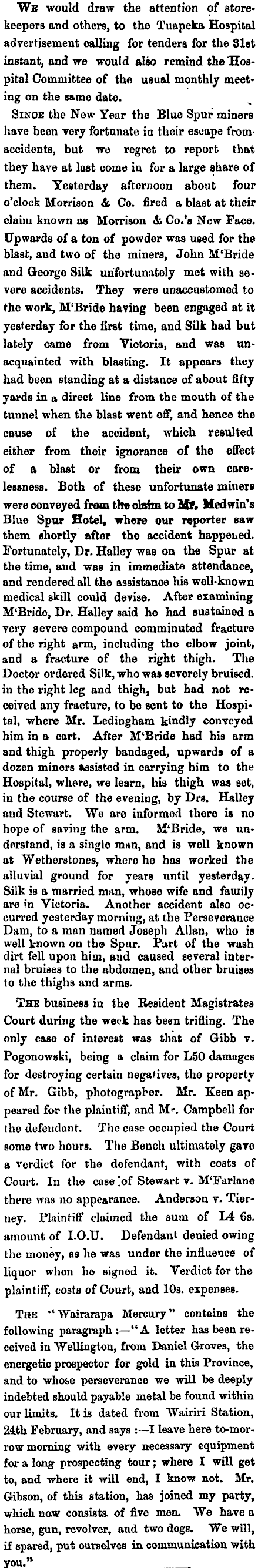 We would draw the attention of storekeepers and others, to the Tuapeka Hospital advertisement calling for tenders for the 31st instant, and we would also remind the Hospital Committee of the usual monthly meeting on the same date. Since the New Year the Blue Spur miners have been very fortunate in their escape from' accidents, but we regret to report that they have at last come in for a large share of them. Yesterday afternoon about four o'clock Morrison & Co. fired a blast at their claim known as Morrison & Co.'s New Face. Upwards of a ton of powder was used for the blast, and two of the miners, John M'Bride and George Silk unfortunately met with severe accidents. They were unaccustomed to the work, M'Bride having been engaged at it yesterday for the first time, and Silk had but lately came from Victoria, and was unacquainted with blasting. It appears they had been standing at a distance of about fifty yards in a direct line from the mouth of the tunnel when the blast went off, and hence the cause of the accident, which resulted either from their ignorance of the effect of a blast or from their own carelessness. Both of these unfortunate miners were conveyed from the claim to Mf. Medwin's Blue Spur Hotel, where our reporter saw them shortly after the accident happened. Fortunately, Dr. Halley was on the Spur at the time, and was in immediate attendance, and rendered all the assistance his well-known medical skill could devise. After examining M'Bride, Dr. Halley said he had sustained a very severe compound comminuted fracture of the right arm, including the elbow joint, and a fracture of the right thigh. The Doctor ordered Silk, who was severely bruised. j in the right leg and thigh, but had not re- \ ceived any fracture, to be sent to the Hospital, where Mr. Ledingham kindly conveyed him in a cart. After M'Bride had his arm and thigh properly bandaged, upwards of a dozen miners assisted in carrying him to the Hospital, where, we learn, his thigh was set, in the course of the evening, by Drs. Halley and Stewart. We are informed there is no hope of saving the arm. M'Bride, we understand, is a single man, and is well known at Wetherstones, where he has worked the alluvial ground for years until yesterday. Silk is a married man, whose wife and family are in Victoria. Another accident also occurred yesterday morning, at the Perseverance Dam, to a man named Joseph Allan, who is well known on the Spur. Part of the wash dirt fell upon him, and caused several internal bruises to the abdomen, and other bruises to the thighs and arms. The business in the Resident Magistrates Court during the week has been trifling. The only case of interest was that of Gibb v. Pogonowski, being a claim for LSO damages for destroying certain negatives, the property of Mr. Gibb, photographer. Mr. Keen appeared for the plaintiff, and Mr. Campbell for the defendant. The case occupied the Court some two hours. The Bench ultimately gave a verdict for the defendant, with costs of Court. In the case !of Stewart v. M'Farlane there was no appearance. Anderson v. Tierney. Plaintiff claimed the sum of L 4 6s. amount of 1.0. U. Defendant denied owing the money, as he was under the influence of liquor when he signed it. Verdict for the plaintiff, costs of Court, and 10s. expenses. The *' Wairarapa Mercury" contains the following paragraph: — "A letter has been received in ■Wellington, from Daniel Groves, the energetic prospector for gold in this Province, and to whose perseverance we will be deeply indebted should payable metal be found within our limits. It is dated from "Wairiri Station, 24th February, and says :— I leave here to-mor-row morning with every necessary equipment for a long prospecting tour ; where I will get to, and where it will end, I know not. Mr. Gibson, of this station, has joined my party, which now consists of five men. "We have a horse, gun, revolver, and two dogs. We will, if spared, put ourselves in communication with you."