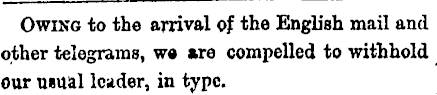 Owing to the arrival of the English mail and other telegrams, we are compelled to withhold our usual leader, in type.