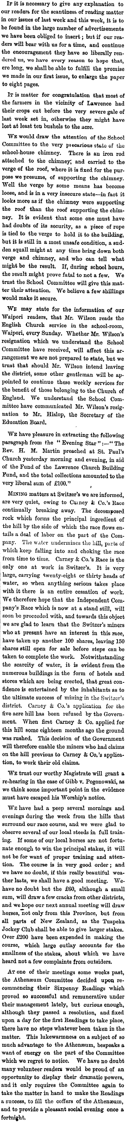 If it is necessary to give any explanation to our readers for the scantiness of reading matter in our issues of last week and this week, it is to be found in the large number of advertisements we have been obliged to insert ; but if our readers will bear with us for a time, and continue the encouragement they have so liberally rendered us, we have every reason to hope that, ere long, we shall be able to fulfill the promise we made in our first issue, to enlarge the paper to eight pages. It is matter for congratulation that most of the farmers in the vicinity of Lawrence had their crops cut before the very severe gale of last week set in, otherwise they might have lost at least ten bushels to the acre. We would draw the attention of the School Committee to the very piecarious state of the school-house chimney. There is an iron rod attached to the chimney; and carried to the verge of the roof, where it is fixed for the purpose we presume, of supporting the chimney. Well the verge by some means has become loose, and is in a very insecure state— in fact it looks more as if the chimney were supporting the roof than the roof supporting the chimney. It is evident that some one must have had doubts of its security, as a piece of rope is tied to the verge to hold it to the building, but it is still in a most unsafe condition, a sudden squall might at any time bring down both verge and chimney, and who can tell what might be the result. If, during school hours, the result might prove fatal to not a few. We trust the School Committee will give this matter their attention. We believe a few shillings would make it secure. We may state for the information of our Waipori readers, that Mr. Wilson reads the English Church service in the school-room, Waipori, every Sunday. Whether Mr. Wilson's resignation which we understand the School j Committee have received, will affect this arrangement we are not prepared to state, but we trust that should Mr. Wilson intend leaving the district, some other gentleman will be appointed to continue these weekly services for the benefit of those belonging to the Church of England. We understand the School Committee have communicated Mr. Wilson's resignation to Mr. Hislop, the Secretary of the Eduoation Board. We have pleasure in extracting the following paragraph from the " Evening Star ":—"" :— " The Bey. H. M. Max-tin preached at St. Paul's Church yesterday morning and evening, in aid of the Fund of the Lawrence Church Building Fund, and the total collections amounted to the very liberal sum of £100." Mining matters at Switzer's we are informed, are very quiet, owing to Carney k Co.'s Race continually breaking away. The decomposed rock which forms the principal ingredient of the hill by the side of which the race flows entails a deal of labor on the part of the Company. The water undermines the hill, parts of which keep falling into and choking the race from time to time. Carney & Ca's Race is the only one at work in Switzer's. It is very large, carrying twenty-eight or thirty heads of water, so when anything serious takes place with it there is an entire cessation of work. We therefore hope that the Independent Company's Race which is now at a stand still, will soon be proceeded with, and towards this object we are glad to learn that the Switzer's miners who at present have an interest in this race, have taken up another 100 shares, leaving 150 shares still open for sale before steps can be taken to complete the work. Notwithstanding the scarcity of water, it is evident from the numerous buildings in the form of hotels and stores which are being erected, that great confidence is entertained by the inhabitants as to the ultimate success of mining in the Switzer's district. Carney & Co.'s application for the five acre hill has been refused by the Government. When first Carney & Co. applied for this hill some eighteen months ago the ground was rushed. This decision of the Government will therefore enable the miners who had claims on the hill previous to Carney & Co.'s application, to work their old claims. We trust our worthy Magistrate will grant a re-hearing in the case of Gibb v. Pogonowski, as we think some important point in the evidence must have escaped his Worship's notice. We have had a peep several mornings and evenings during the week from the hills that surround our race course, and we were glad to observe several of our local steeds in full training. If some of our local horses are not fortunate enough to win the principal stakes, it will not be for want of proper training and attention. The course is in very good order ; and we have no doubt, if this really beautiful weather lasts, we shall have a good meeting. Wehave no doubt but the £60, although a small sum, will draw a few cracks from other districts, and we hope our next annual meeting will draw horses, not only from this Province, but from all parts of New Zealand, as the Tuapeka Jockey Club shall be able to give larger stakes. Over £200 have been expended in making the course, which large outlay accounts for the smallness of the stakes, about which we have heard not a few complaints from outsiders. At one of their meetings some weeks past, the Athenaeum Committee decided upon recommencing their Sixpenny Readings which proved so successful and remunerative under their management lately, but curious enough, although they passed a resolution, and fixed upon a day for the first Readings to take place, there have no steps whatever been taken in the matter. This lukewarmne&s on a subject of so much advantage to the Athenaeum, bespeaks a want of energy on the part of the Committee which we regret to notice. We have no doubt many volunteer readers would be proud of an opportunity to display their dramatic powers, and it only requires the Committee again to take the matter in hand to make the Readings a success, to fill the coffers of the Athenaeum, and to provide a pleasant social evening once a for