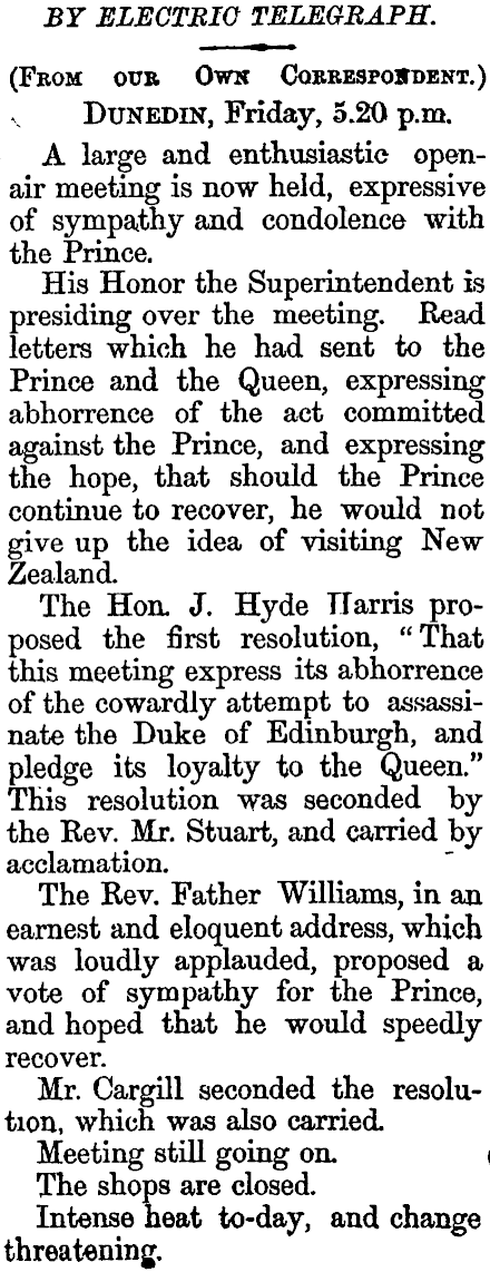 BY ELECTRIC TELEGRAPH. (From our Owk Cobbespojtdbnt.) Dunedin, Friday, 5.20 p.m. A large and enthusiastic openair meeting is now held, expressive of sympathy and condolence with the Prince. His Honor the Superintendent is presiding over the meeting. Read letters which he had sent to the Prince and the Queen, expressing abhorrence of the act committed against the Prince, and expressing the hope, that should the Prince continue to recover, he would not give up the idea of visiting New Zealand. The Hon. J. Hyde Harris proposed the first resolution, "That this meeting express its abhorrence of the cowardly attempt to assassinate the Duke of Edinburgh, and pledge its loyalty to the Queen." ■ This resolution was seconded by ■ the Rev. Mr. Stuart, and carried by acclamation. The Rev. Father Williams, in an earnest and eloquent address, which was loudly applauded, proposed a ; vote of sympathy for the Prince, and hoped that he would speedly recover. Mr. Cargill seconded the resolution, which was also carried. Meeting still going on. i The shops are closed. Intense heat to-day, and change threatening.