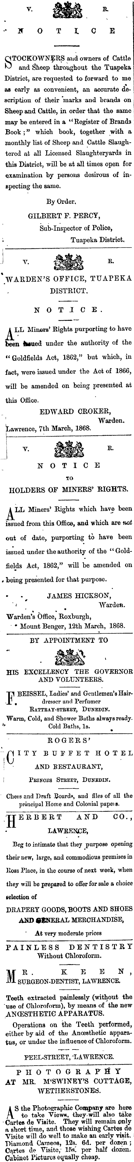 - 2T O T I G E QTOCKOWNERS and owners of Cattle £5 and Sheep throughout the Tuapeka District, are requested to forward to me as early as convenient, an accurate description of their marks and brands on Sheep and Cattle, in order that the same may be entered in a "Register of Brands Book ; " which book, together with a monthly list of Sheep and Cattle Slaughtered at all Licensed Slaughteryards in this District, -will be at all times open for examination by persons desirous of inspecting the same. By Order. GILBERT F. PERCY, Sub-Inspector of Police, i Tuapeka District. * WARDEN'S OFFICE, TUAPEKA DISTRICT. NOTJ C E . A LL Miners' Rights purporting to have been ifesued under the authority of the " Goldfields Act, 1862," but which, in fact, were issued under the Act of 1866, will be amended on being presented at this Office. EDWARD OROKER, Warden. Lawrence, 7th March, 1868. NOTICE TO HOLDERS OF MINERS' RIGHTS. A LL Miners' Rights which have been issued from this Office, and which are not out of date, purporting to have been issued under the authority of the " Goldfields Act, 1862," will be amended on . being presented for that purpose. - . f JAMES HICKSON, Warden. • • Warden's Office, Roxburgh, • Mount Benger, 12th March, 1868. BY APPOINTMENT TO HIS EXCELLENCY THE GOVERNOR AND VOLUNTEERS. Tjl BEISSEL, Ladies' and Gentlemen's Hair.JJ . dresser and Perfumer Rattbay-stbeet, Ditnedik. Warm, Cold, and Shower Baths always ready. ** Cold Baths, Is. ROGERS' Ip|ITY BUFFET HOTEL I AND RESTAURANT, ! Pbikoes Stbeet, Dtoedik. Chess and Draft Boards, and files of all the principal Home and Colonial papei s. TT E R B E R T AND CO., LAWRENCE, Beg to intimate that they purpose opening their new, large, and commodious premises in Hobs Place, in the course of next week, -when they will be prepared to offer for Bale a choice selection of DRAPERY GOODS, BOOTS AND SHOES AND GENERAL MERCHANDISE, ' At very moderate prices PAINLESS DENTISTRY Without Chloroform. MR . KEEN, SURGEON-DENTIST, LAWRENCE. Teeth extracted painlessly (without the use of Chloroform), by means of the new ANESTHETIC APPARATUS. j Operations on the Teeth, performed, either by aid of the Anoesthetic appara- | tvs, or under the influence of Chloroform, j PEEL-STREET, "LAWRENCE. | PHOTOGRAPHY AT MR. M'SWINEY'S COTTAGE, WETIIERSTONES. A S the Photographic Company are here j\ to take Views, they-will also take Cartes de Visite. They will remain xmly a short time, and those wishing Cartes de Visite will do well to make an early visit. T>iamond Cameos, 12s. 6d. per dozen ; Cartes de Visito/ 15s'. per half dozen. Cabinet Pictures equally cheap.
