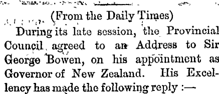. i ■ ,-,,. (From the Daily Times) During its late session, the Provincial Council, agreed to ai* Address to Sir George liowen, on his appointment aa Governor of New Zealand. His Excellency has made the following reply :—: —