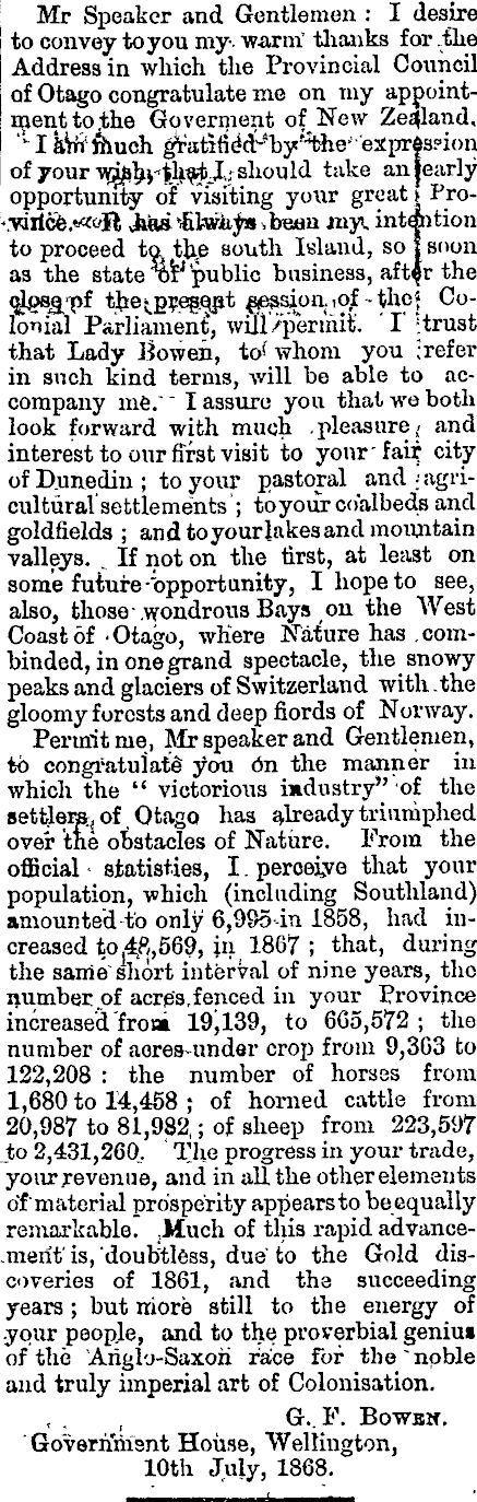 Mr Speaker and Gentlemen : I desire to convey to you my. w-arm' thanks for .the Address in which the Provincial Council of Otago congratulate mo on my appointment to .the Goverment of New Zealand, V I a^much gr'atine i d^by^e--'expr|s?ion of your w^hj-fh^lc should take anjearly opportunity of visiting your great > Pro--mricb.«t<*fl Jkw €lwkya *beaa my* intuition to proceed ta the south Island, so f soon as the state public business, aftfr the cjgsjTpf tb-e^ege^nt ~thc| Colonial Parliament', wul/perinil'. ' I itrust that Lady Jfowen, to^whom you -refer in such kind terms, will be able to accompany me." I assure you that we both look forward with much .pleasure,- and interest to our first visit to yonrfai? city of D.unedin ; to your pastoral and ; agricultural'settlements'; to your coalbeds and goldfields ; and to your lakes and mountain valleys. .. If not on the first, at least on some future -"opportunity, I hope to see, also, those -.wondrous Bays ;on the West Coast of ■ Otago, where Nature has comI binded, in one grand spectacle, the snowy peaks and glaciers of Switzerland with .the gloomy forests and deep fiords of Norway. Permit me, Mr speaker and Gentlemen, to congratulate you on the manner in which the " victorious industry" of the Bettler&j of, Otago has already triumphed over the obstacles of Nature. From the official- statistics, I. perceive that your population, which (including Southland) amounted -to only 6,985 in 1858, had increased in 1867 ; that, during | the same" short interval of nine years, the | number of acres, fenced in your Province increased fro* 19;i39, to 605,572; the number of aores-under crop from 9,363 to 122,208 : the number of horses from 1,680 to 14,458 ; of horned cattle from 20,987 to 81,982, ; of sheep from 223,597 jto 2,431,260. The progress in your trade, your revenue, and in all the other elements oT material prosperity app'earsto beequally remarkable. ,Much of this rapid advance--merit' is, doubtless, due to the Gold discoveries of 1861, and the succeeding years ; but more still to the energy of your people, and to the proverbial geniut of the Anglo-Saxon race For the " noble and truly imperial art of Colonisation. G.. F. Bowbw. ' Goverh'msnt House, Wellington, 10th July, 1868.