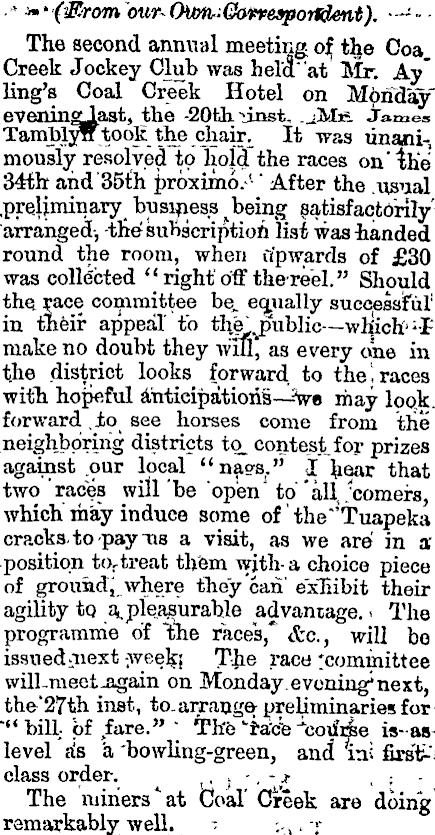 ..**,* (Mrom own OiMi:(Zm>e»portdent). •—-■■ The second annual meeting ojr the Coa Creek Jockey Club was held" 'at' Mr. Ay" ling's Coal Creek Hotel on Mpnday" jevenin^last, the -20th -dnst. .JMe. James TamblyW took the cham It was unam-, mously resolved to ho|d"the races on' the 34th and '3sth proximo.' ' After the .usual .preliminary business satisfactorily'arranged, -the? subscription lisi was handed round the room, when rfpwards of £30 was collected " right' off thereel." Should ' the. race committee be, etjiially successful 1 in their appeal' to thfelpublic — wluch'' 1 -!' make no doubt they will, as every one in the district looks forward to the traces with hopeful anticipations— ; ?we may loo,k. forward ,io see horses come from the .neighboring districts to_ contest, for prizes against .our local " nags." I hear that two "races will 'be open 1 to 'all, .'comers, which' may induce some of ' the' Tuapeka cracks, to pay "as a visit, as we are in a" -position to., treat them with- a choice piece of ground; where they 'can' exliibit thenagility to, a^ pleasurable advantage. < The programme of the races,* &c, will bo issued^iiext -week.! The raca will-meet -again on Monday.evcning*next, the'27th inst, to. arrange; preliminaries for « - f< biU ; of fare." ' Thb k kce -^coifrie i*-as-level a's a 'bowling-green, and! mi firs'f; class order. i ■ j '•*,-*■ ; The miners* at Coal' Creek are doing remarkably well. - -,. x . -^