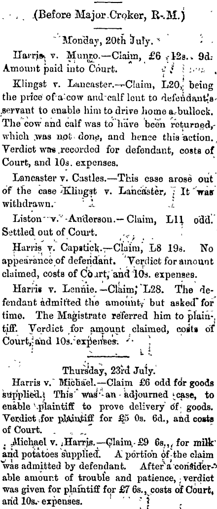 . • , . .(Before Major .Croker, R-.M.j ~ 'Monday, 20th lluTy. * - - Uarrjs-k v. Mtmco. — Claim, £6 ,-12s. k 9d.Amount paid iuto Court. £$ ;:■<;, , Klingst v. Lancaster. -T-C!aim, L2o,j beiug the price ofa^cow andcalf lent to defendant(B' .servant to enable him to drive home a,-bullock. The cow and calf was to' have been roturned,which .was not done, and hence thia iaction. Verdict was .recorded for defendant, costs of Court, and 10s. expenses. Lancaster v. Castles. — This case arose out of the case 'Eliugst v. Lancaster, 7 It "Iras' withdrawn." ' 1 ,1 Liston"v."'-An J derßon.— Claim, Lll odd. Settled out of Court. ,f., f . ' Harris y. Capiticfc.— Claim," L 8 19s. No appearance of defendant. Verdict for amount claimed, costs of Cd art; and 10s. expenses. Harris v. Lennie. —Claim; 'L2B. The defendant admitted the amount,- but asked" fof time. The Magistrate referred him to plain-, tiff. Verdict for amount claimed, coita of Courts and lOs/exjierfßes-. '• • ii Thursday, 23rd July.' Harris v." Michael. — Claim £6 odd for goods ! • siip'pliecl.l This' was' '- an • adjourned to j enable to prove delivery 61 • goods, j Verdict : for pJAinJdff for £5 Os. 6d., and coats j of Court. .„„„.' . .Michael v. ;Harrjs.— Claim,- £9 65,, , for milk' and potatoes supplied. A" portion of-the claim was admitted by defendant. After^a consider- 1 * able amount of trouble and patience, -verdict j was given for plaintiff for £7 6s. v costs of Court, ; arid 10s.* expenses. I - '