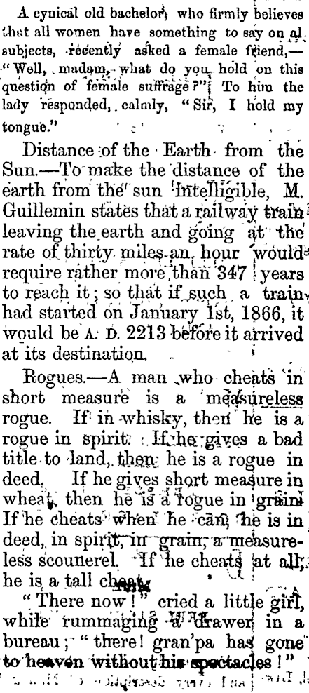 A cynical old bacheWj who firmly believes thttt all women have something to say on aJL subjects, recently asked a female fsend, — -" Well, v madam,- what do you-- hold on this question of female suffrage?"]; To him the lady 'respo.nd.ed, . calmly, " Sir, I hold my tongue." "c ' v " . - Distance {of the 'Earth- from the Sun. — To" make the distance of the earth from the' sun ! ffitelligibie, M. Guillemin states that a railway trafot- r leaving the.earth and going at' 1 the rate of thirty, mile?-an, hour 'wottld^ require rather more/than 5347S 347 j years to reach it jso that if jjuch a train> had started on January Ist, 1866, it would be A. D. 2213 : betforeit arrived at its destination. - ' * Bogues. — A man who-c heats iii short measure is a ' mqafojireless rogue. If : in -whisky, theri He is a rogue in spirit; t.lfch.eirgi^es a bad title- to land,.tibsn: he is a rogue in deed. If he gi^es shojrt measure in whea^ then hell a* Ttigue in jgranJ If 'he <jheats- l! w*h'e]£ he ; : cais tfak is in deed,. in spirtt^itr'graTnrarnieVisureless scounerel. ~lf "tie cheat! jat aUj; he is, a tall chggig * : _ " There now \~ cried a little gTrT, while 1 rumrriajojinf -W^aweij in a bureau ;- " there ! gran'pa has? gone' to heftvta withou^hi» spectacles •' "