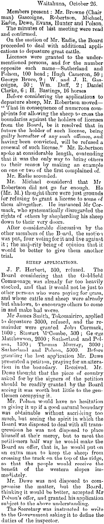 Waitahuna, October 2Q. Members present : Mr. Browne (Chair man) Gascoigne, Robertson, Michael, EucHe, Dewe, Evans, Hunter and Poison. The minutes of Idsk meeting were read and confirmed. On the motion of Mr. Eadie, the Board proceeded to deal with additional applications to depasture great cattle. Licenses were granted to the undermentioned persons, and for the number opposite each name— Sutherland and Poison, 100 head ; Hugh Cameron, 50 ; Georae Bnice, 9 ; W. and J. It. Gascoiyrie, 50 ; Wm. Dnff, 2 ; Daniel Clarke, 6 ; H. Bastings, 16 horses Before considering the applications to depasture sheep, Mr. Robertson moved — " That in consequence of numerous complaints for allowing the sheep t<> cross the boundaries against the holders of licenses from the Board, be it resolved that in future the holder of such license, beins^ gnilfy hereafter of any sueJi ofFence, and having been convicted, will be refused a renewal of such license." Mr. Robertson spoke at considerable length, contending that it was the only way to bring others to their senses by making an example on one or two of the first complained of. Mr. Eadie seconded. Mr. Michael considered that Mr Robertson did not go far enouyh. He (Mr. M.) thought there were just grounds for refusing to grant a license to some of them altogether. He instanced Mr Cormack, who systematically disregarded the rights of others by shepherding his sheep down to their very doors. After considerable discussion by the other members of the Board, the motioi was put, four voting for it and live against it ; the majority being of opiiiiou that it would be better to give them another trial, SHEEP APPLICATIONS. J. F. Herbert, 500, refused. The Board considering that the Gold field Commonage, was already far too heavily stocked, and that it would not be just to other persons who were paying for grass, and whose cattle and sheep were already but shadows, to encourage others to come in and make bad worse. Mr James Smith, Tokomairiro, applied to depasture 3000, refused, and the remainder were granted John Cormack, jlHOO; Stewart M 'Combe, 500; Gorge Matthfiwson, 2000 ; Sutherland and Polson, 1500 ; Thomas Murray, 3000 ; [ Sutherland and Poison, 5000. Before giMnfing Ihe Inst appMcation Mr. Dawe presented a petition, praying for an alteration in the boundary. Received. Mr. Dowe thoii'jfht that the piece of country asked for by the signers of the petition should be readily granted by the Board seeing it was worth but little to the genllenton occupying it. Mr. Poison would have no hesitation in giving it up if a good natural boundary was obtainable without sacriiicing too much, but seeing the spirit in which the Board was disposed to deal Avith all transgressions he was not disposed to place himself at their mercy, but to meet the petitioners half way he would make the Board an offer, that is, he would put on sin extra man to keep the sheep from crossing the track on the top of tlie ridge, so th.afc the people would receive ilie benefit of the western slopes immediately. Mr. Dewe was not disposed to compromise the matter, but the Board, thinking it would be better, accepted Mr Poison's offer, and granted his application subject to the above understanding. The Secretary was instructed io vrrlie to the Government asking it to define the duties of the inspector.