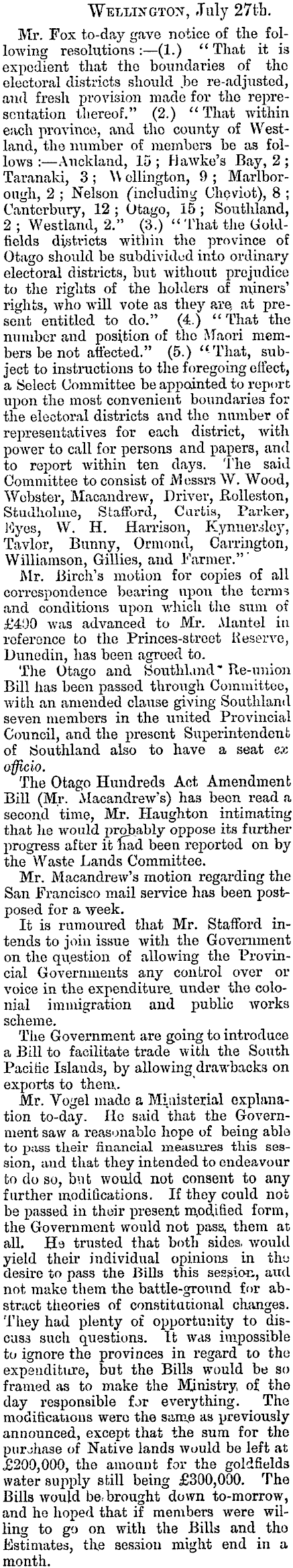 Wellington, July 27th. Mr. Fox to-day gave notice of the following resolutions :—(1.): — (1.) " That it is expedient that the boundaries of the electoral districts should .be re-adjusted, and fresh provision made for the representation thereof." (2.) " That within each province, and tho county of Westland, the number of members be as follows : — Auckland, 15 ; Hawke's Bay, 2 ; Taranaki, 3 ; \V cllington, 9 ; Marlborough, 2 ; Nelson (including Chpviot), 8 ; Canterbury, 12 ; Otago, 15 ; Southland, 2 ; Westland, 2." (3.) " That the Goldfields districts within the province of Otago should be subdivided into ordinary electoral districts, but without prejudice to the rights of the holders of miners' rights, who will vote as they are, at present entitled to do." (4.) "That the number and position of the Maori members be not affected." (5.) "That, subject to instructions to the foregoing effect, a Select Committee be appointed to report upon the most convenient boundaries for the electoral districts and the number of representatives for each district, with power to call for persons and papers, and to report within ten days. The said Committee to consist of Messrs W. Wood, Webster, Macandrew, Driver, E,olleston, Studholine, Stafford, Curtis, Parker, Wyes, W. H. Harrison, Kynueiylcy, Tavlor, Bunny, Ormond, Carrington, Williamson, Gillies, and Farmer." ' Mr. Birch's motion for copies of all correspondence bearing upon the term? and conditions upon which the sum of £400 was advanced to Mr. Mantel in refer once to the Princes-street Reserve, Dunedin, has been agreed to. The Otago and Southland" Re-union Bill has been passed through Committee, with an amended clause giving Southland seven members in the united Provincial Council, and the present Superintendent of Southland also to have a seat ex officio. The Otago Hundreds Act Amendment Bill (Mr. Alacandrew's) has been read a second time, Mr. Haughton intimating that he would probably oppose its further progress after it nad been reported on by the Waste Lands Committee. Mr. Macandrew's motion regarding the San Francisco mail service has been postposed for a week. It is rumoured that Mr. Stafford intends to join issue with the Government on the question of allowing the Provincial Governments any control over or voice in the expenditure, under the colonial immigration and public works scheme. The Government are going to introduce a Bill to facilitate trade with the South Pacific Islands, by allowing drawbacks on exports to them. Mr. Yogel made a Ministerial explanation to-day. He said that the Government saw a reasonable hope of being able to pass their financial measures this session, and that they intended to endeavour to do so, but would not consent to any further modifications. If they could not be passed in their present modified form, the Government would not pass, them at all. Ha trusted that both sides, would yield their individual opinions in thu desire to pass the Bills this session, aud not make them the battle-ground for abstract tiieories of constitutional changes. They had plenty of opportunity to discuss such questions. It was impossible to ignore the provinces in regard to the expenditure, but the Bills would be so framed as to make the Ministry, of. the day responsible for everything. The modifications were the same as previously announced, except that the sum for the purchase of Native lands would be left at £200,000, the amount for the goldfields water supply still being £300,000. The Bills would be- brought down to-morrow, and he hoped that if members were willing to go on with the Bills and tho Estimates, the session might end in a month.