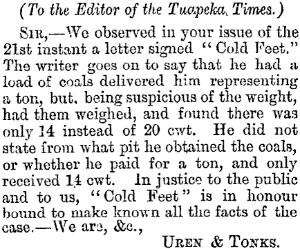(To the Editor of the Titapefak Times.) Slit, — We observed in your issue of the 21st instant a letter signed " Cold Feet." The writer goes on to say that he had a load of coals delivered him representing a ton, but, being suspicious of the weight, had them weighed, and found there was only 14 instead of 20 cwt. He did not state from what pit he obtained the coals, or whether he paid for a ton, and only received 14 cwt. In justice to the public and to us, "Cold Feet" is in honour bound to make known all the facts of the case. — We ara, &c, UREN & TONKS.