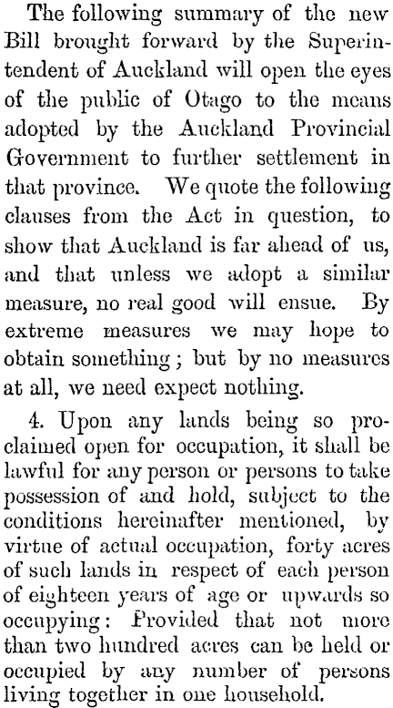 The following summary of the new Bill brought forward by the Superintendent of Auckland will open the eyes of the public of Otago to the means adopted by the Auckland Provincial Government to further settlement in that province. We quote the following clauses from the Act in question, to show that Auckland is far ahead of us, and that unless we adopt a similar measure, no real good will ensue. By extreme measures we may hope to obtain something ; but by no measures at all, we need expect nothing. 4. Upon any lands being so proclaimed open for occupation, it shall be lawful for any person or persons to take possession of and hold, subject to the conditions hereinafter mentioned, by virtue of actual occupation, forty acres of such lands in respect of each person of eighteen years of age or upwards so occupying : Provided that not more than two hundred acres can be held or occupied by any number of persons living together in one household.