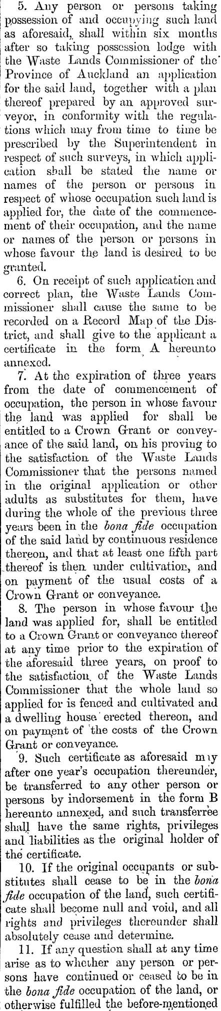 5. Any person or persons taking possession of and occupying such land as aforesaid,, shall within six months after so taking possession lodge with the Waste Lands Commissioner of the' Province of Auckland an application for the said land, together with a plan thereof prepared by an approved surveyor, in conformity with the regulations which may from time to time be prescribed by the Superintendent in respect of such surveys, in Avhich application shall be stated the name or names of the person or persous in respect of whose occupation such land is applied for, the date of the commencement of their occupation, anil the name or names of the person or persons in whose favour the land is desired to be granted. 6. On receipt of such application and correct plan, the Waste Lands Commissioner shall cause the same to be recorded on a Record Map of the District, and shall give to the applicant a certificate in the form A hereunto annexed. 7. At the expiration of three years from the date of commencement of occupation, the person in whose favour the land was applied for shall be entitled to a Crown Grant or conveyance of the said land, on his proving to the satisfaction of the Waste Lauds Commissioner that the persons named in the original application or other adults as substitutes for them, have during the whole of the previous three years been in the bona fide occupation of the said land by continuous residence thereon, and that at least one fifth part .thereof is then under cultivation,, and on payment of the usual costs of a Crown Grant or conveyance. 8. The pei'son in whose favour the land was applied for, shall be entitled to a Crown Grant or conveyance thereof at any time prior to the expiration of the aforesaid three years, on proof to the satisfaction, of the Waste Lands Commissioner that the whole land so applied for is fenced and cultivated and a dwelling house. ' erected thereon, and on payment of the costs of the Crown Grant or conveyance. 9. Such certificate as aforesaid mvy after one year's occupation thereunder, be transferred to any other person or persons by indorsement in the form B hereunto annexed, and such transferree shalj have the same rights, privileges and liabilities as the original holder of the certificate. 10. If the original occupants or substitutes shall cease to be in the bona fide occupation of the lancf, such certificate shall become null and void, and all rights and privileges thereunder shall absolutely cease and determine. 11. If any question shall at any time arise as to whether any person or persons have continued or ceased to be in the bona fide occupation of the land, or otherwise fulfilled the before-m,entioned
