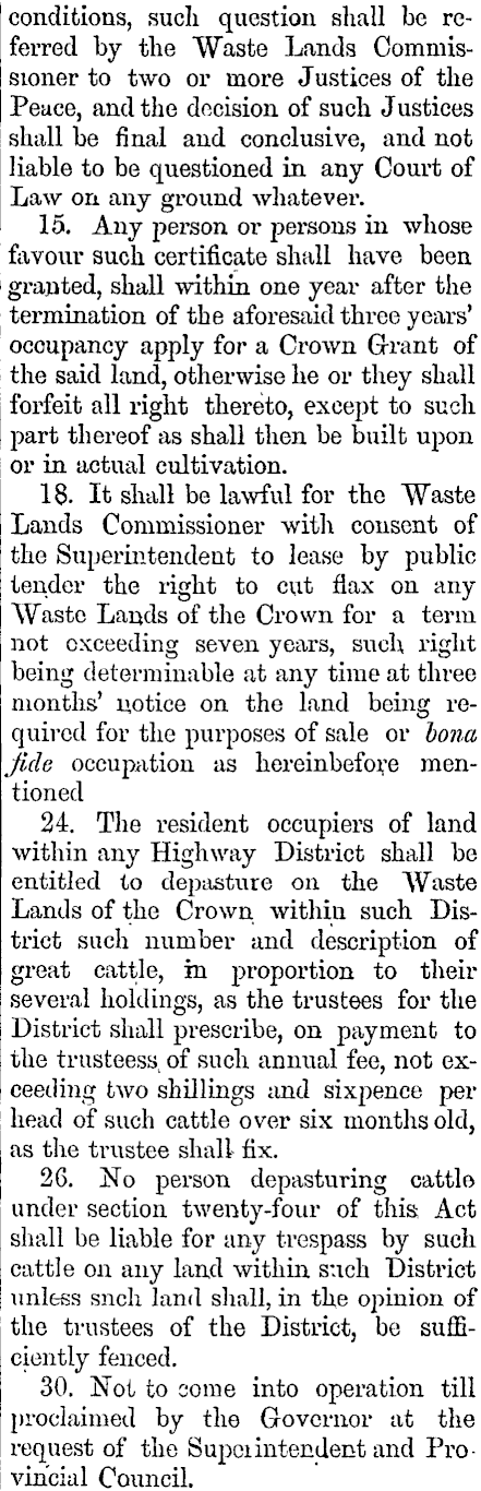conditions, such question shall be referred by the Waste Lands Commissioner to two or more Justices of the Peace, and the decision of such Justices shall be final and conclusive, and not liable to be questioned in any Court of Law on any ground whatever. 15. Any person or persons in whose favour such certificate shall have been granted, shall within one year after the termination of the aforesaid three years' occupancy apply for a Crown Grant of the said land, otherwise he or they shall forfeit all right thereto, except to such part thereof as shall then be built upon or in actual cultivation. 18- It shall be lawful for the Waste Lands Commissioner with consent of the Superintendent to lease by public tender the right to cut flax on any Waste Lands of the Crown for a term not exceeding seven years, such right being determinable at any time at three months' notice on the land being required for the purposes of sale or bojia fide occupation as hereinbefore mentioned 24. The resident occupiers of land within any Highway District shall be entitled to depasture on the Waste Lands of the Crown within such District such number and description of great cattle, in proportion to their several holdings, as the trustees for the District shall prescribe, on payment to the trusteess, of such annual fee, not exceedmg two shillings and sixpence per head of such cattle over six months old, as the trustee shall- fix. 26. No person depasturing cattle under section twenty-four of this; Act shall be liable for any trespass by such cattle on any land within such District \mlfcss snch land shall, in the opinion of the trustees of the District, be sufficiently fenced. 30. Not to come into operation till proclaimed by the Governor at the request of the Superintendent and Provincial Council.