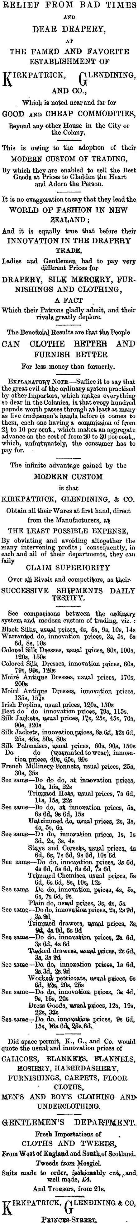 RELIEF FROM BAD TIMES AKD DEAR DRAPERY, AT THE FAMED AND FAVORITE ESTABLISHMENT OP T7IRKPATRICK, /ILENDINING, AND CO., Whioh i 8 noted near and far for GOOD and CHEAP COMMODITIES, Beyond any other House in the City or the Colony, This is owing to the adoption of their MODERN CUSTOM OF TRADING, By which they are enabled to sell the Best Gtaoda at Prices to Gladden the Heart and Adorn the Person. It is no exaggeration to say that they lead the WORLD OF FASHION IN NEW SEAfcAND j And it is equally true that before their INNOVATION IN THE DRAPERY TRADE, Ladies and. Gentlemen had to pay very different Prices for DRAPERY, SILK MERCERY, FURNISHINGS AND CLOTHING, A FACT Which their Patrons gladly admit, and their rival* greatly deplore. The Beneficial Results are that $h% People CAN CLOTHE BETTER AND FURNISH BETTER For less money than formerly. Explanatory Note. — Suffice it to say that the great evil of the ordinary system practised by other Importers, which makes everything so dear in the Colonies, iathatevei^ hundred pounds worih passes through at least as many as fire tradesmen's hauds. before it oom.es to them, each one having a commission of from 24 to 10 per cent., which makes an aggregate advance on the cost of from 20 to 30 per oens« which, unfortunately, the consumer has to pay for. - The infinite advantage gained by the MODERN; CUSTOM is that KIRKPATRTCK, GLENDINTNG, & CO. Obtain all their Wares at first hand, direct from the Manufacturers, &\ THE JJEIAST POSSIBLE EXPENSE, By obviating and avoiding altogether the many intervening profits ; consequently, in each and all of their departments, they can faily CLAIM SUPERIORITY Over ajft Rivals and competitors, as fceirSUCCESSIVE SHIPMENTS DAILY TESUFYSee comparisons between tfce ajdwwiy system, &ftd. modern custom of trading, viz. : Black Silks, ussval pws.S* 4s, 6s, 9s, 10s, 14s Warraniod do, innovation prices, Sfc, ss, 6s 6d, Bs, 10s Colored Silk Dresses, usual prices, 80s, 100s, 120s, 150s Colored SiJk, Dresses, innovation pifices^ 60s, 795, 995, 120s Moire Antique Dresses, usual prices, 170s, 200s Moire Antique Dresses, innovation prices, 1355, 15? b Irish Poplins, us^al prices, 120s* 130s Best do do innovation prices* tQs^ 115s. Silk Jask.efci, i^vial prices, 17;S, 255, 455, 70s, 90s, 120s Silk Jackets, innovation, pjfices» 8% 6/d, ])2s Gel, 255, 455, 50s, 80s Silk Polonaises, usual prices, 60s, 90s, 150s Do do (wairrantedtowear.)* innovation, prices^ 40%, 6jss, 90s French Millinery.' Bonnets, usual prices, 255, 30s, 35s See same — Do do do, at. iniaovation psiQes, 10* 15s>. 22s Tuimjiiied Ha%3, usual prices, 7s 6d, Us, 15s, 22s See same— Do do, at innovation prices, ss> 6s H 9s 6d, 15s Untrimmsd, do* usual pri<se% 2s, 3s, 4s fc ss, 6s, See same — Do do, innovation prices, Is, Is 3d, 2s, 3s, 4s Stays and Corset gsual prices* 4s 6d, 6s, 7s 6d, 9s 6d, 10s 6d See same — Do do, innovation prices, 3s. 6d, 4s 6d, 5s 6d, 6s 6d, 7s 6d Trimmed Chemises, usual prices, 5s H 65.6 d, Ss^lOSi 12sSee samft Po, dio, innovation, pjficss, 4s* ss* 6s, t& 6d, 9s. Plain do, usupl poises, 3s, 4s> ss. See same — Dodo, innovation- prices* 2s, 2s 9d, 35.9) d Tiiimmed drawers, v^wtl prices, 3s, 9<4aod, 6s9d See same— Do <jo, innoxatiiott prices, 2*. 6d, 3s6d, 4s6d Tta&ked draweje, usu^l pcicqs, 2s 6d y 3s, 359)4 See same— Do, do, innosation prices, Is 6d, Bs.3d, &9d Wouk.eji- petticoats, wv&l jwiiees, 6s 6d, D 2&. 20s, 20s , See same — Do. do,, innovation, prices, 3* 4d, ' 9s, 16s, 20s Dress Goods* usual prices, 12s, 19s, 22s* 33* See, same— Do, do, innoxaAioo- prices, 9s 6d, ' 155,. Ms. 64. 205, 6d>. Did space penmifc, X., G., and Co. would quote the usual! and innovation prices of CALICOES, BLANKE'BS, FLANNELS, HOSIERY, HABERDASHERY, FURNISHINGS, CARPETS, FLOOR CLOTHS* MEN'S AND BOY'S CLOTHING AND* UNDERCLOTHING. GENTLEMEN'S DEPARTMENT. Fresh Importations of CLOTHS AND TWEEDS* From West of England and South, of Scotland. Tweeds from Mosgiel. Suits made to order, fashionably cut, and well made* £4, And Trousers, from 21s. i RIRKPATRICK, ALENDINING& CO, 1 PSISfQ^S-STRBBX. - j