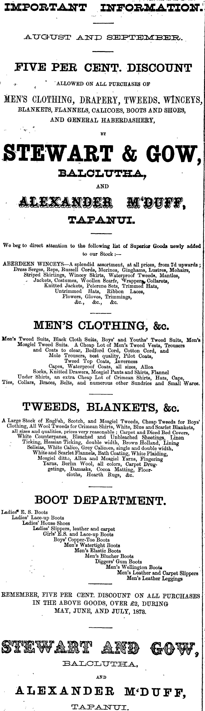 IMPORTANT HTFOHMATIOIT. FIVE PEE CENT. DISCOUNT * *• . ALLOWED ON ALL PURCHASES OF MEN'S CLOTHING, DRAPERY, TWEEDS, WtNCEYS, BLANKETS, FLANNELS, CALICOES, BOOTS AND SHOES, AND GENEBAL HABEBDASHEBT, BY STEWART & GOW, BALCLTJTHA, AND TAFAxnn. We beg to direct attention to the following list of Superior Goods newly added to our Stock : — ABERDEEN WINCEYS— A splendid assortment, at all prices, from 7d upwards j Dress Serges, Reps, Russell Cords, Merinos, Ginghams, Lustres, Mohairs, Striped Skirtings, Wincey Skirts, Waterproof Tweeds, Mantles, - Jackets, Costumes, Woollen Scarfs, Wrapper^ Collarets, Knitted Jackets, Pelerene Sets, Trimmed Hats, Untrimmed Hats, Ribbon Laces, Flowers, Gloves, Trimmings, &c, &c., &c. MEN'S CLOTHING, &c. Men's Tweed Suits, Black Cloth Suits, Boys' and Youths' Tweed Suits, Men's Mosgiel Tweed Suits. A Cheap Lot of Men's Tweed Vests, Trousers and Coats to clear, Bedford Cord, Cotton Cord, and Mole Trousers, best quality, Pilot Coats, Tweed Top Coats, .Inverness Capes, Waterproof Coats, all sizes, Alloa Socks, Knitted Drawers, Mosgiel Pants and Shirts, Flannel Under Shirts, an extra Cheap Lot of Crimean Shirts, Hats, Caps, Ties, Collars, Braces, Belts, and numerous other Sundries and Small Wares. TWEEDS, BLANKETS, &c. A Large Stock of English, Scotch, and Mosgiel Tweeds, Cheap Tweeds for Boys' Clothing, All Wool Tweeds for Crimean Shirts, White, Blue and Scarlet Blankets, all sizes and Qualities, prices very reasonable ; Carpet and Diced Bed Covers, White Counterpanes, Bleached and Unbleached Sheetings, Linen Ticking, Hessian Ticking, double width, Brown Holland, Lining Selisias, White Calico, Grey Calicoes, single and double width, White and Scarlet Flannels, Bath Coating, White Plaiding, Mosgiel ditto, Alloa and Mosgiel Yarns, Fingering Yarns, Berhn Wool, all colors, Carpet Druggetings, Damasks, Cocoa Matting, Floorcloths, Hearth Rugs, &c. BOOT DEPARTMENT. Ladies* E. S. Boots Ladies' Lace-up Boots Ladies 1 House Shoes Ladies' Slippers, leather and carpet Girls' E.S. and Lace-up Boots Boys' Copper-Toe Boots Men's Watertight Boots Men's Elastic Boots Men's Blucher Boots Diggers' Gum Boots Men's Wellington Boots Men's Leather and Carpet Slippers Men's Leather Leggings BEMEMBEB, FIVE PEE CENT. DISCOUNT ON ALL PURCHASES IN THE ABOVE GOODS, OVEB £2, DURING MAY, JUNE, AND JULY, 1878. ALEXANDER M'DUFF,