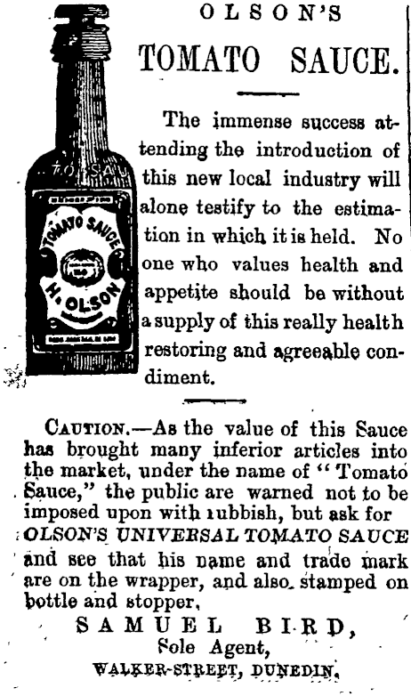 ■qpa O L 8 O N'S fil TOMATO SAUCE. HiJH The immense success atJKII|L tending the introduction of ■ MHgJljgfl this new local industry will fcK <n *y"lMalon9 testify to the estimaw£l tion in wMch it ia held. No ■P^g&n|one who values health and &^ OLS jl^| appetite should be without ■QJI!S2CH a supply of this really health ISbBSSSh restorin g and agreeable con--pfj diment. Caution.— As the value of this Sauce has brought many inferior articles into the market, under the name of " Tomato . Sauce," the public are warned not to be imposed upon with lubbish, but ask for ; OLSOff'S VNIVEBBAL TOMATO SAUCE and see that his name and trade mark ' are on the wrapper, and also, stamped on bottle and stopper, SAMUEL BIRD, Pole Agent, ' - VALUER-STREET, EB *BT?