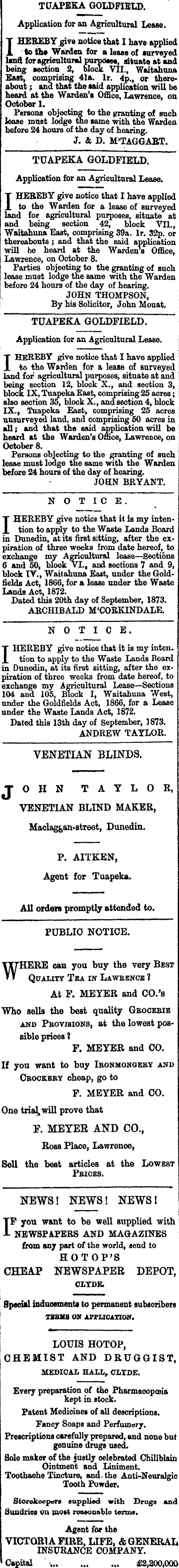 TUAPBKA GOLDFIELD. Application for an Agricultural Lease. T HEBEBY give notice that I have applied 1 to th» Warden for a lease of surveyed l*nd foragrieultuml purpoaes, situate at and being section 2, block VII., Waitahuna East, comprising 41a. lr. 4p\, or there* about ; ana that the said application will be heard at the Warden's Office, Lawrence, on October 1. Persons objecting to the granting of such lease mast lodge the same with the Warden before 24 hours of the day of hearing. J. & D. M'TAGGAET. TUAPEKA GOLDFIELD. Application for an Agricultural Lease. T HEBEBY give notice that I have applied X to the Warden for a lease of surveyed land for agricultural purposes, situate at and being section 42, block VII., Waitahuna East, comprising 39a. lr. 32p. or thereabouts ; and that the said application will be heard at the Warden^ Office, Lawrence, on October 8. Parties objeoting to the granting of such lease must lodge the same with the Warden before 24 hours of the day of hearing. JOHN THOMPSON, By his Solicitor, John Mouat. TUAPEKA GOLDFIELD. Application for an Agricultural Lease. I HEREBY give notice that I have applied to the Wurden for a lease of surveyed land for agricultural purposes, situate at and being Bection 12, block X., and section 3, block IX, Tuapeka East, comprising 25 acres ; also section 35, block X., and section 4, block IX., Tuapeka East, comprising 25 acres unsurveyed land, and comprising 50 acres in mil ; and that the said application will be heard at the Warden's Omce, Lawrence, on October 8. Persons objecting to the granting of such lesae must lodge the same with the Warden I before 24 hours of the day of hearing. JOHN BRYANT. NOTICE. T HEREBY give notice that it is my intenX tion to apply to the Waste Lands Board in Dunedin, at its first sitting, after the expiration of three weeks from date hereof, to exchange my Agricultural lease — Sections 6 and 50, block VI., and sections 7 and 9, block TV., Waitahuna East, under the Goldfields Act, 1866, for a lease under the Waste Lands Act, 1872. Dated this 20th day of September, 1873. ARCHIBALD M'CORKINDALE. NOTICE. I HEREBY give notice that it is my inten. tion to apply to the Waste Lands Board in Dunedin, at its first sitting, after the expiration of three weeks from date hereof, to exchange my Agricultural Lease — Sections 104 and 105, Block I, Waitahuna West, under the Goldfields Act, 1866, for a Lease under the Waste Lands Act, 1872. Dated this 13th day of September, 1873. ANDREW TAYLOR. VENETIAN BLINDS. JOHN TAYLOR, VENETIAN BLIND MAKER, Maclaggan-street, Dunedin. P. AITKEN, Agent for Tuapeka, All orders promptly attended to. PUBLIO NOTICE. WHERE can you buy the very Best Quality Tba in Lawbbncb ? At F. MEYER and CO.'s Who sells the best quality Geocebie and Peovxsions, at the lowest possible prices ? F. MEYER and CO. If you want to buy Ironmongery and Crockery cheap, go to F. MEYER and CO. One trial,, will prove that F. MEYEB AND CO., Ross Place, Lawrence, Sell the best articles at the Lowest Prices. NEWS! NEWS! NEWS! IF you want to be veil supplied with NEWSPAPERS AND MAGAZINES from any part of the world, send to HOTOP'S CHEAP NEWSPAPER DEPOT, CLYDE. Special inducement* to permanent subscribers TOBICS ON APPUCATKHf . LOUIS HOTOP, CHEMIST AND DRUGGIST, MEDICAL HALL,. CLYDE. Every preparation of the Pharmacopeia kept in stock. Patent Medioinet of all descriptions. Fancy Soaps and Perfumery. Prescriptions carefully prepared, and none but genuine drugs used. Sole maker of the justly celebrated Chillblain Ointment and Liniment. Toothache Tincture, and, the Anti-Neuralgic Tooth Powder. Storekeepers supplied with Drugs and Sundries on motf reasonable term: Agent for the VTCTQRI A FIRE, LIFE, & GENERAL INSURANCE COMPANY. Capital , £2,200,000