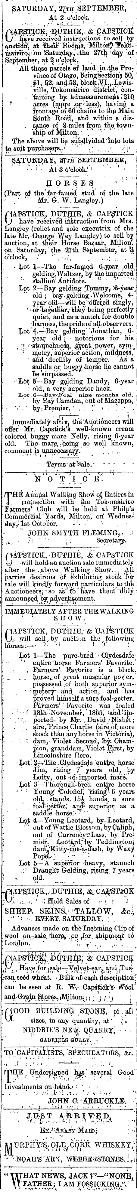 SATURDAY, 27th SEPTEMBER, At 2 o'clock. AABST|CE r D,UTHTE,, pAB^TIO^ \j have received instructions to sell by i*acrtM*; At %ei^Ho6^,'Mflt6T^ 1r Pbkfe- . mair&Q^'on rSaturday^the 27th day of September, at o'clock, v, , ' . All those parcels of land. in the Pro-j 1 vinceof Otago, being^Sectiotis 50J' $1 , §2;, ands3, block ville, Tokomairiro district,' con- - 'taining by. kdmeasuremejit acres (mpre .or; v less), having a frontage of 60 chains to the Main South RoaU, ahd within a dis- ,. , tanqe' o£ 2.. miles frpin the.tcjwns^ip of lililton. " ". "." The above will be subdiyided'lnto lots to, suit purchasers.,' . ' L \ ._, «/ . jh* §A-TUKp,A¥; arTff sefteMdek, ->'■ -At : 3 o'clock. 1 ' '"- ' • HORSES c ! ' (Part of the far-famed stud of the late - / " Mr.' (t. W. Langley.) riAPSTICK,, DUTHIE, & CAPSTICK \J have received instruction from Mrs. Langley (relict and sole executrix of the late Mr, .Crepi-ge' Y(ey Langley) to sell by auction, at their Horse Bazaar, Milton, on Saturday; the -27th September, *at o'clock, .' v ' '';,<-,<,', ,; ,_ , Z/ot I—The far r famed .6. r j;oar ,old; 1 " gelding.Ayaltzer, by the imported' ' stallion 1 Antidote. ' i; J "' ' ""' Lot 2— Bay gelding Tommy, :6-year J old; bay , gelding -Welcome, 4"y_ ear" old—w ill be^dffered singly, r < of'iogetKer/they being perfectly quiet, and as-a-tuatch for-double liaruess, the pride of all^observers. Lof"4.— Bay gelding' "Jonathan, 6year old j ■ notorious for his : -y / utJivjnchuess, .great, power, sym- s ■ " T metry, superior.action, mfl^ne^s, : • and ■ docility of ' temyfer. As a^ 1 saddle or buggy .hors : e he cannot be surpassed. ■Lot s— Bay gelding Dandy, 6-year ' old, a very superior hack. ljot-6 — -JBajr/25'0Al nine months old, ' by Ray Camden, out of Mazeppa, '■ ' '* by: Premier, ' , , ';'.•: . / '. Immediately after, the Auctioneers will offer- Mr. Capstick'a well-known cream colored buggy mare Nelly, rising 6 -year old. The/ mare, ;b,eing so well known, comment is unnecessary. , , i .. Terms" afr^ale.- - 'n'VVi c* cI rPHE Annual Walking Show of Entires in i coiXncctibn with the Tokomairiro Farmers* C3ub will ne held at Philp's Commercial ' Yard's, Miltoti;' orf Wednesday,- Ist October, -"• -' '• , ■ ' JOHN SMYTH FLEMING,, .i i t -,''!"'■■ -, Secretary. nA^PSTICK, DUTHIE, & CAPSTICK \j will hold an auction sala immediately after the .above Walking - Show. ,. A}l parties' desirous of ' exhibiting stock rojr sale will kindly forward particulars to tlik Auctioneers', ; so as"* t*6 * have them ' "iluly j announced bjr IMMEDIATELY AFTER THE. WALKING ' 5 SHOW. HAPSTICK, DUTHIE, & 'OAPSTICK \J: will sell , by " auction the following horses:— •» IT Lot I—The1 — The pure-bred >' -Clydesdale '[ j - " eutire 'horse Farmers' Favorite. 1 , -Farn\ers ? , Favorite is a black, •'* . Jior3e,.of great muscular pov"er, ', : possessed ,of both superior sym-i ■ ''mejery- and. action, and has, -. proved himself, a sure foal-getter. Farmers' ' Favorite was "foaled '■"•■■'< 18ih- 'November, ' 1865,' -'ahd'ihi- ' " ..' f., pprtedt by Mr. , Davi^ > Nisb^t ; : . , sire r Txiuce Charlie (sirejoi more \ s^tock than any horse in Victoria), '■•- '- t dam, 'Violet -Second, iby, Champion, gra.nddam, Yiolot F.irst, by Lincolnshire Hero. I -Lot '. 2.^-rT.he , CSLy desda-Je . entire, horse Jim, rising 7" years old, by •Lofty, out -of j imported mare.' Lot' 3— Thurougli-bre'd entire horse '- ' '■ Youn£ 'Coloiiel, 1 Hslngl6 years old, . stands* 154 hands, a sure foar-getter.," ance superior as a . ' saddle horse.'- : Lot 4 — Young Leotard, by~ Leotard, ' '"' out of Wattle, BJossom, by Caliphj, : out of Currency?: Lass, by Pre-| • • mier." ; Cebta,rd,"-b.y Teddingtonj dam',, % Eitty-'c'ut-a»aash, by Waxy Pope V. : : ': "-■ i Lot 5— A superior -heavy, staunch .:• Draught Welding, risiqg. 7 years s -, dd. r n.APSTJCK,/JDUTHIE, &jCA^STIQK :V, : . ii.-i. ' m Hold Sales of •<• [ r J ' SHEEP-. SKfNS v '"''EALL0 n W, Ac] :.-'•> '.. ETIKRY.SATURBAYi ! . Advances made on the' lncoming Clip of ;w.ool pnnsale, rhere 9 ,pr. ( fpr.^hipm^t to rLondon. * ' <.▼',.<, .", •■ OAJNSri&tSJt iJUTHiE: & CAPSTICK y } i; r Hav.e jfor jsalje— Yelvet-ear^ and |Tus[cau ; seed wheat. .B^lk f >t teagh descripUpn: can be seen at R. Wv Caps' &<&'& *^t5ol" and-Gr.aui (Miltoj^) j i j ;. -j j G1 OOD BUILDING ; SXOSE, pf . all t sizes, in any quantity, at" \ . NIDDRIK'S .NE\V V QUARRY,' GABRIELS Ct'UltliY. . . : Tp QA^rriiiisTS, speculators, &c. rnHE Undersigned has several Good - I /.•> l - "-\ . r r ''.:.•, .-^V '. < ,i i Investments on ; hind.': : ' • ' JOHN a^ABBUCKLB. \ ; %' f . -.:t o- .:• ,;..-') ■ • JU-ST A-JB B I V-'B D. "' ,-r : Ir,- r , |A;f -r-i p-j.-rf, »■{. '•■ E^-iSK'iBY'MAii)/ ;■' iffTJRPHT^, 9JL^CQ|IK WHISKEY; * -.NQAH'S 'AItK,' WEI»HBBSiraNEB.j,f <' WHAT NEWS, JACK ?'*— "NONE, I T FATHER jI AM FOSSICKING."^ "