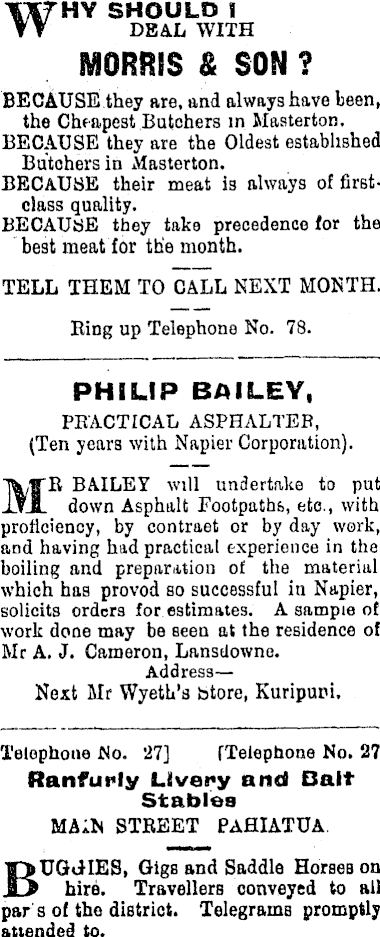 HY SHOULD I » i DEAL WITH MORRIS & SON ? BECAUSE they are, and always have been, the Cheapest Butohers in Masterton. BECAUSE they are the Oldest established Butchers in Masterton. BECAUSE their meat is always of firstclass quality. BECAUSE they take precedence for the best meat for the month. TELL THEM TO CALL NEXT MONTH. Bing up Telephone No. 78. PHILIP BAILEY, PRACTICAL ASPHALTEB, (Ten years with Napier Corporation). R BAILEY will undertake to put . down Asphalt Footpath&, etc., with proficiency, by contract or by day work, and having had practical experience in the boiling and preparation of the material which has provod so successful in Napier, solicits orders for estimates. A sample of work done may be seen at the residence of Mr A. J. Cameron, Lanstlowne. Address — Next Mr Wyeth's btore, Kuripuri. Telephone No. 27] [Telephone No. 27 Ranfurty Lively and Bait Stables MAIN STREET PAHIATUA. UGJIES, Gigs and Saddle Horseß on 1 hire. Travellers conveyed to all par sof the district. Telegrams promptly attended to.