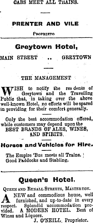 CABS MEET ALL TiiAINS. PRENTER AND VILE Greytown Hotel, MAIN STREET GREYTOWN THE MANAGEMENT r ISH to notify the res dents o! ▼ v . Greytown and the Travelling Public that, in taking over the above well-known Hotel, no efforts will be spared in providing for their comfort generally. Only the best accommodation offered, while customers may depend upon the BEST BRANDS OF ALES, WINES, AND SPIRITS. Horses and Vehicles for» Hire. The Empire 'Bus meets all Trains. J Good Paddocks and Stabling. Queen and Benai.li Streets, Masterton. a NEW and commodious house, well f\ furnished, and up-to-date' in every respect. Splendid accommodation provided. A MODERN HOTEL. Best of Wines and Liquors. J. O'NEILL, Proprietor.