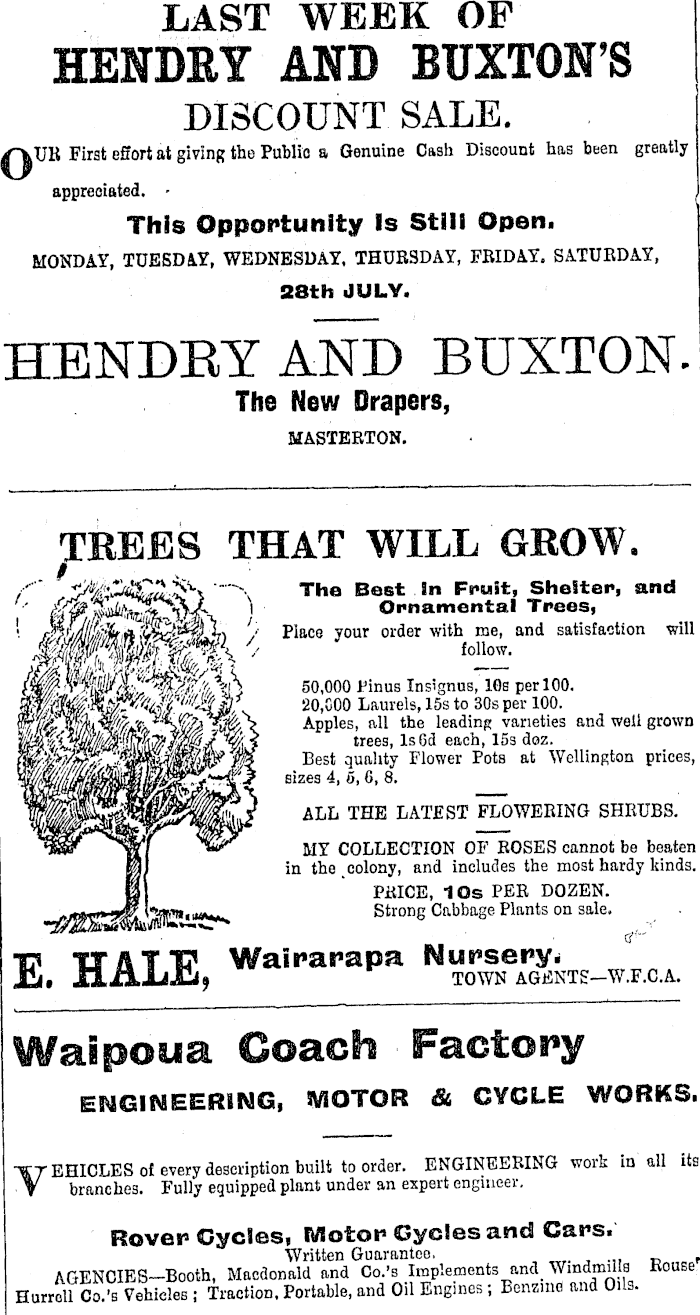 LAST WEEK OF DISCOUNT SALE. jkUK First effort at giving the Public a Genuine Cash Discount has been greatly appreciated. - This Opportunity Is Still Open. MONDAY, TUESDAY, WEDNESDAY, THURSDAY, FRIDAY. SATURDAY, 28th JULY. HENDBY AND BUXTON. The New Drapers, MASTERTON. TREES THAT WILL GROW. —\ The Best ■ ln F«"l*! Shelter, and i ' Ornamental Trees, ftxftfmX) / Place your order with me, and satisfaction will wwsmms y tiSS 50,000 Pinus Insignus, 10s per 100. yyjf/. 20,000 Laurels, 15s to 30s per 100. 7 }fm\ Apples, all the leading varieties and well grown fiJCwi trees, ls6d each, 15s doz. '*"" JL . Best quality Flower Pots at Wellington prices, 1 sizes 4, 5, 6, 8. ) ALL THE LATEST FLOWERING SHRUBS. MY COLLECTION OF ROSES cannot be beaten in the colony, and includes the most hardy kinds. PRICE, 10S PER DOZEN. Strong Cabbage Plants on sale. Wairapapa Nu psei»y\ 19 TOWN AGiSNTS—W.F.C.A. ENGINEERING, MOTOR & CYCLE WORKS. ■EHICLES of every description built to order. ENGINEERING work in all its branches. Fully equipped plant under an expert engineer. Rover Cycles, Wlotot* Cycles and Cars. Written Guarantee. *,„„„„r AGENOIES-Booth, Macdonald and Co.'s Implements and Windmills Rouse -roll Co.'sVehicles ; Traction. Portable, and Oil Engines; Benzine and Oils.