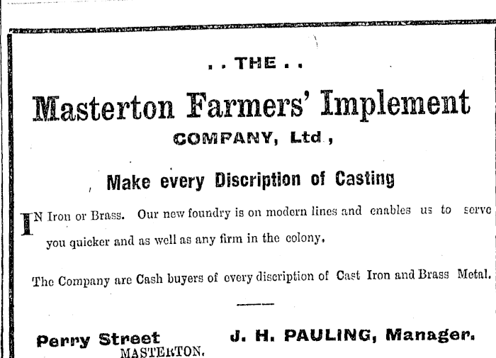 ■ • THE ■ • *Y, Ltd , Make every Description of Casting N Iron or Brass. Our now foundry is on modern lines and enables us to servo you quicker and as well as any firm in the colony. The Company are Cash buyers of every discription of Cast Iron and Brass Metal. Penpv Street J. H. PAULING, Manager. MASTEKTON.