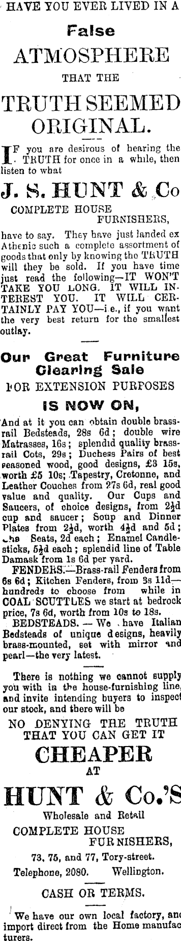 ' HAVE YOU EVER LIVED IN A False ATMOSPHERE THAT THE TEUTH SEEMED ORIGINAL. [F you are desirous of hearing the • TRUTH for once in a while, then listen to what J. S.HUNT &,Co COMPLETE HOUSE FURNISHERS, have to say. They have just landed ex Atbenic such a complete assortment of goods that only by knowing tho TKUTH will they be sold. If you have time just read the following-IT WON'T TAKE YOU JUONG. IT WILL INTEREST YOU. IT WILL CERTAINLY PAY YOU—i e., if you want the very best return for the smallest outlay. Our* Great Furniture Clearing Sale 10R EXTENSION PURFOSES And at it you can obtain double brassrail Bedsteads, 28s 6d; double wire Matrasses, 16s; splendid quality brassrail Cots, 295; Duchess Pairs of best reasoned wood, good designs, £3 Ids, worth £5 10s; Tapestry, Cretonne, and Leather Couches from 27s 6d, real good value and quality. Our Cups and Saucers, of choice designs, from 2sd oup and saucer; Soup and Dinner Plates from 2£d, worth 4Jd and sd; whs Seats, 2d each; Enamel Candlesticks, 5Jd each; splendid line of Table Damask from Is 6d per yard. FENDERS'.—Brass-rail Fenders from 6s 6d; Kitchen Fenders, from 3s lidhundreds to choose from while in COAL SCUTTLES we start at bedrock price, 7s 6d, worth from 10s to 18s. BEDSTEADS. —We . have Italian Bedsteads of unique designs, heavily brass-mounted, set with mirror ind pearl—the very latest. There is nothing we oannot supply you with ia the house-furnishing line, and invite intending buyers to inspeot our stock, and there will be NO DENYING THE TRUTH THAT YOU CAN GET IT HUNT & Co.T Wholesale and Retail COMPLETE HOUSE FURNISHERS, 73, 75, and 77, Tory-street. Telephone, 2080. Wellington. CASH OR TERMS. ' We have our own local factory, an import direct from the Home manufac turers.