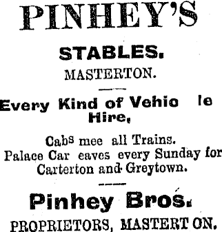 PINHEY'S STABLES. MASTESTON. Every Kind of Vehio le Hire, Cabs mee all Trains. Palace Car eaves every Sunday for Carterton and- Greytown. Pinhey Bros* PBOPEIETORS, MASTBBTON.