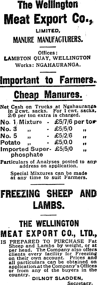 MANURE MANUFACTURERS. Offices: LAMBTON QUAY, WELLINGTON Works: NGAHAURANGA. ortant to Farmers Cheap Manures. Net Cash on Trucks at Ngahauranga In 2cwt. sacks. For 1 cwt. sacks, 2/8 per ton extra is charged. No. MVlixture - £5/7/6 per tor No. i „ - £5/5/0 „ No. 5 „ - £5/2/6 „ Potato „ - £5/0,0 „ Imported Super- £5/5/0 „ phosphate Particulars of Analyses posted to anyv address on application. Special Mixtures can be made at any time to suit Farmers. FREEZING SHEEP AND LAMBS. THE WELLINGTON MEAT EXPORT CO., LTD., IS PREPARED TO PURCHASE Fat Sheep and Lambs by weight, or at per head. The Company also offer* clients every facility lor Freezing on their own account. Prices and all particulars can be obtained on applications the Company's Offices or from any oi the buyers in the country. DILNOT SLADDEN. Secretary.