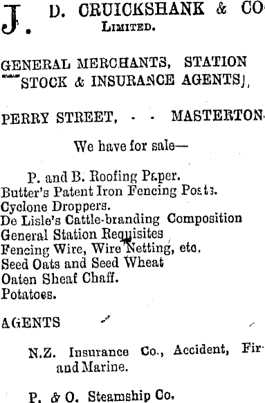 D. ORUICKBHANK & CO, ' . Limited. GENERAL MERCHANTS, STATION ""STOCK & INSURANCE AGENTSJ, PERRY STREET, MASTEBTON. We have for sale— P. and B. Roofing Pf.per. Butter's Patent Iron Fencing Posts. Cyolone Droppers. De Lisle's Cattle-branding Composition General Station Requisites / Fencing Wire, WireTNetting, etc Seed Oats and Seed Wheat Oaten Sheaf Chaff. Potatoes. N.Z. Insurance Co., Accident, Fir and Marine. P. * 0. Steamship Co.