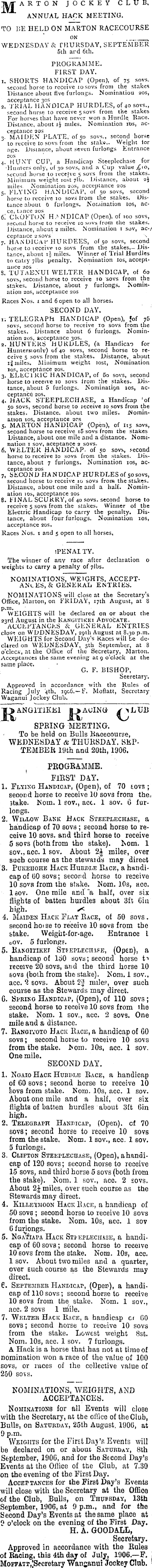 Tft|- ART O N JOCKEY CLUB. ANNUAL HACK MEETING. TO BE HELD ON MARTON RACECOURSE ON WEDNESDAY & THURSDAY, SEPTEMBER sth ard 6th. PROGRAMME. FIRST DAY. 1. SHORTS HANDICAP (Open), of 75 sovs. second horse to receive to sovs from the stakes Distance about five furlongs. Nominatiou 20s, acceptance 30s 2. TRIAL HANDICAP HURDLES, of 40 sovs., second hurse to receive 5 sovs from the stakes For horses that have never won a Hurdlq Race. Distance, about ii miles. Nomination ibs, acceptance 20s 3. MAIDEN PLATE, of 50 sovs., second horse to receive 10 sovs from the stake.. Weight lor ni;e. Distance, about seven furlongs Entrance 20s 4. HUNT CUP, a Handicap Steeplechase for •Hunters only, of 30 sovs, and a Cup value £lO, second horse to receive 5 sovs from the stakes. Minimum weight lost 7H>. Distance, about 24 miles Nomination 20s, acceptance 20s 5. FLYING HANDICAP, of 50 sovs, second horse to receive 10 sovs from the stakes. Distance about 6 furlongs. Nomination 10s, accet t;ince 20s 6'. CKOKToN H * NDICAP (Open), of 100 sovs, second horse to receive ia sovs from the stakes. Distance, about 2 miles. Nomination 1 sov, ac-/ ceptance 2sovs 7. HANDICAP HURDEES, of 50 sovs, second horse to icceive 10 sovs from the stakes.— Distance, about ii miles. Winner of Trial Hurdles to catry ;lbs penalty. Nomination los, acceptance 20s S. TUTaISNUI WELTER HANDICAP, of 60 sovs, second horse to receive 10 sovs from the stakes. Distance, about 7 furlongs. Nomination 20s, acceptance 20s Races Nos. 1 and 6 open to all horses. SECOND DAY. 1; TELEGRAPH HANDICAP (Open), fof y5 sovs, second horse to receive 10 sovs from the stakes. Distance about 6 furlongs. Nomination 20s, acceptance 30s. 2. HUNTERS HURDLES, (a Handicap for Huntersionlv) of 40 soys, second horse to receive 5 sovs from the stakes. Distance, about lj miles. Minimum weight lost, Nomination 10s, acceptance 20s. 3. ELECIKIC HANDICAP, of 5o sovs, second horse to leeeive 10 sovs from the stakes. Distance, about 5 furlongs. Nominatign 10s, acceptance 20s. 4. HACK STEEPLECHASE, a Handicap 'of 50 sovs, second horse to icceive 10 sovs from the stakes. Distance, about two miles. Nomination 10s, acceptauce 20s 5. MARTON HANDICAP (Open), of 115 sovs, second horse to receive i 5 sovs from the stakes Distance, about one mile and a distance. Nomination 1 sov, aceptance 2 sovs. 6. WELTER HANDICAP, of 50 sovs, second horse to receive 10 soys from the stakes. Distance, about 7 furlongs. Nomination ios, acceptance 20s 7. SECOND HANDICAP HURDLES of S o sovs, second horse to receive 10 sovs from the stakes. Distance, about one mile and a half. Nomination ios, acceptance 20s 8. FINAL SCURRY, of 40 sovs. second horse to receive 5 sovs from the stakes. Winner of the Electric Handicap to carry the penalty. Distance, about four furlongs. Nomination 10s, acceptance 20s. Races Nos. 1 and 5 open to all horses, iPENAL TY. The winner of any race after declaration o weights to carry a penalty of 7lbs. NOMINATIONS, WEIGHTS, ACCEPTANCES, & GENERAL ENTRIES. NOMINATIONS will close at the Secretary's Office, Marton, on FRIDAY, 17th August, at 8 p.m. WEIGHTS will be declared on or about the 23rd August in the Ranuitikei Advocate. ACCEPTANCES & GENERAL ENTRIES clow on WDDNESDaY, 29th August at 8.30 p.m. WEIGHTS for Second Day's Races will be decltrcd on WEDNESDAY, sth September, at 8 o'clcck, at the Office of the Secretary, Marton. Acceptances the same evening at 9 o'clock at the same place. G. F. BISHOP, Seeretary. Approved in accordance with the Rules of Racing July '4th, 1906. F. Moflatt, Secretary Waganui Jockey Club. j^> AGINGSPRING MEETING. To be held on Bulls Racecourse, WEDNESDAY & THURSDAY. SEPTEMBER 19th and 20th, 1906. PROGRAMME. ' FIRST DAY. 1. Flying Handicap, (Open), of 70 iovs ; second horse to receive 10 sovs from the, stake. Nom. 1 sov., act. 1 sov. 6 furlongs. 2. Willow Bank Back Steeplechase, a handicap of 70 sovb ; second horse to receive 10 sovs. and third horse to receive 5 sovs (both from the stake). Nom. 1 sov., acc. 1 sov. About 'l\ miles, over such course as the stewards may direct 3. Puicehohe Hack Hurdle Race, a handicap of (50 sovs; second horse to receive 10 sovs from the stake. Nom. 10s, hco. lsov. One mile and "a half, over six flights of batten hurdles about 3ft Gin high. 4. Maiden Hack Flat Race, of 50 sovs. second hotse to receive 10 sovs from the stake. Weight-for-age. Entrance i cov. 5 furlongs. 5. Ranoixikei Stfepleciiafe, (OpeD), a handicap of 150 sovs; second horse t"> receive 20 sovs, and the third horse 10 sovs (both from the stake). Nom. 1 sov., acc. 2 sovs. About milep, over such course as the Stewards may direct. G. Spring Handicap, (Open), of 110 sovs; second horse to receive 10 sovs from ihe stake. Nom. 1 sov., acc. 2 sovs. One miie and a distance. 7. Rangiyoto Hack Race, a handicap of CO sovs; second horse to receive 10 sovs from the stake. .Nom. 10s, acc. 1 sov. One mile. SECOND DAY. 1. Ngaio Hack Huddle Race, a handicap of GO sovs; second horse to receive 10 fcovs from stake. Nom. 10s, acc. 1 sov. About one mile and a half, over six flights of batten hurdles about 3ft Gin high. 2. Telegraph Handicap, (Open), of 70 sovs; second horse to receive 10 sovs from the stake. Nom. 1 sov., acc. 1 sov. 5 furlongs. 3. Clifton Steeplechase, (Open), a handicap of 120 sovs; second horse to receive 15 sovs, and third horse 5 sovs (both from the stake). Nom. 1 sov., acc. 2 sovs. About miles, over such course as the Stewards may direct. 4. Killeymoon Hack Race, a handicap of 50 sovs ; second horse to receive 10 sovs from the stake. Nom. 10s, acc. 1 sov 6 furiongs. 5. NoivfiAPA Hack Steeplechase, a handicap of 60 sovs; second horse to receive 10 sovs from the stake. Nom. 10s, acc. lsov. About two miles and a quarter, over Euch course as the Stewards may direct. 6. September Handicap, (Open), a handicap of 110 sovs; second horse to receive 10 sovs from the stake. Nom. 1 sov., acc. 2 sovs 1 mile. 7. Welter Hack Race, a handicap cr GO sovs; Eecond horse to receive