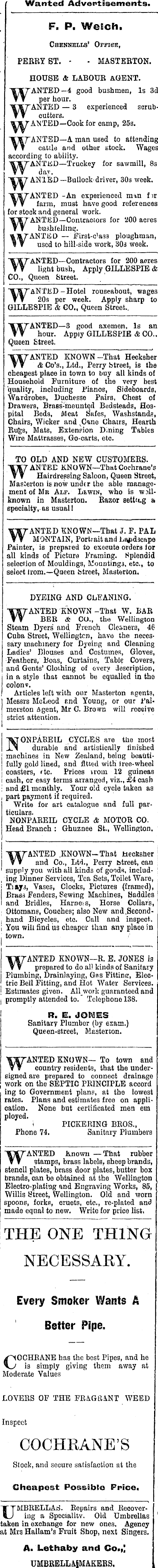 Wanted Advertisements. F. P. WeEch. Chennblls' Offise, PERRY BT. - • MASTERTON. w w HOUSE & LABOUR AGENT. ANTED—4 good bushmen, Is 3d per hour. ANTED cutters. ANTED—Cook for camp, 255. A man used to attending cattle and other stock. Wages according to ability. ANTKD—Truckey for sawmill, 8s day. ANTED—Bullock-driver, 30s week. W' ANTED -An experienced nnn fir farm, must have good references for stock and general work. ANTED—Contractors for '2OO acres bushtelhng. ANTIfiD used to hill-side work, 30s week. ANTED—Contractors for 200 acres light bush, Apply GILLESPIE & CO., Queen Street. WANTED -Hotel rouseabout, wages 20s per week. Apply sharp to GILLESPIE & GO., Queen Street.. WANTED —3 good axemen. Is an hour. Apply GILLESPIE & CO.. Queen Street. WANTED KNOWN-That Hecksher & Go's., Ltd., Perry Street, is the cheapest place in town to buy all kinds of Household Furniture of the very best quality, including Pianos, Sideboards, Wardrobes, Duchesse Pairs, Chest of Drawers, Brass-mounted Bedsteads, Hospital Beds, Meat Safes, Washstands, Chairs, Wicker and v Cane Chairs, Hearth Rugs, Mats, Extenpion Dining Tables Wire Mattrasses, Go-carts, etc. TO OLD AND NEW CUSTOMERS. WANTED KNOWN—ThatCoehrane's Hairdressing Saloon, Queen Street, Masierton is now under the able management of Mr Alf. Li.win, who is wallknown in Masterton. Razor eettdg a specialty, as usual 1 WANTED KNOWN—That J. F. PAL M9NTAIN, Portrait and Landscape Painter, is prepared to execute orders for all kinds of Picture Framing. Hplendid selection of Mouldings, Mountings, etc., to select Irom.—Queen fetreet, Masterton, DYEING AND CLEANING. ANTED KNOWN -That W. BAR BER <£• CO., the Wellington Steam Dyers an 4 French Cleaners, 46 Cuba Street, Wellington, have the necessary machinery for Dyeing and Cleaning Ladies' Blouses and Costumes, Gloves, Feathers, Boas, Curtains, Table Covers, and Gents' Clothing of overv description, in a style that cannot be equalled in the colonv. Articles left with our Masterton agents, Messrs McLeod and Young, or our Palmerston Agent, Mr C. Brown will receive strict attention. T&TONPAREIL CYCLES are the most .Li durable and artistically lini'shed machines in New Zealand, being beautifully gold lined, and fitted with tree-wheel coasters, rtc. Prices irom 12 guineas cash, or easy terms arranged, viz., £4 cash and £1 monthly. Your old cycle taken as part payment if required. Write for art catalogue and full particulars. NONPAREIL CYCLE & MOTOR CO. Head Branch : Ghuznee St., Wellington. WANTED .KNOWN-That Hecksher and Co., Ltd., Perry btreet, can supply you with all kinds of goods, includ- , ing Dinner Services, Tea Sets, Toilet Ware, j Tiaji, Vases, Clocks, Pictures (framed), Brass Fenders, Sewing Machines, Saddles I and Bridles, Harness, Horse Collar's, I Ottomans, Couches; also New and.Secondi hand Bicycles, etc. Call and inspect, i You will find us cheaper than any place in town. WANTED KNOWN—R. E. JONES is prepared to do all kinds of Sanitary Plumbing, Drainlaying, Gas Fittincr, Electric Bell Fitting, and Hot Water Services. Estimates given. All work guaranteed and promptly attended to. Telephone 138. R. E. JONES Sanitary Plumber (by exam.) Queen-street, Masterton. "ANTED KNOWN- To town and country residents, that the undersigned are prepared to connect drainage work on the SEPTIC PRINCIPLE accord ing to Government plans, at the lowest rates. Plans and estimates free on application. None but certificated men em ployed. i PICKERING BROS., Phone 74. Sanitary Plumbers WANTED Known —That rubber stamps, brass labelß, sheep brands, stencil plates, brass door plates, butter box brands, can be obtained at the Wellington Eleotro-plating and Engraving Works, 85, Willis Street, Wellington. Old and worn spoons, forks, cruets, eto., re-plated and made equal to new. Write for price list, THE ONE THING NECESSARY. Every Smoker Wants A Better Pipe. COCHRANE has the best Pipes, and he is simply giving them away at Moderate Values LOVERS OF THE FRAGRANT WEED Inspect COCHRANE'S Stock, and secure satisfaction at the Cheapest Possible Price. UMBRELLAS. Repairs and Recovering a Specialitv. Old Umbrellas taken in exchange for new ones. Agency at Mrs Hallam's Fruit Shop, next Singers. A. Lethaby and C 0.,; UMBRELLA|MAKERS,