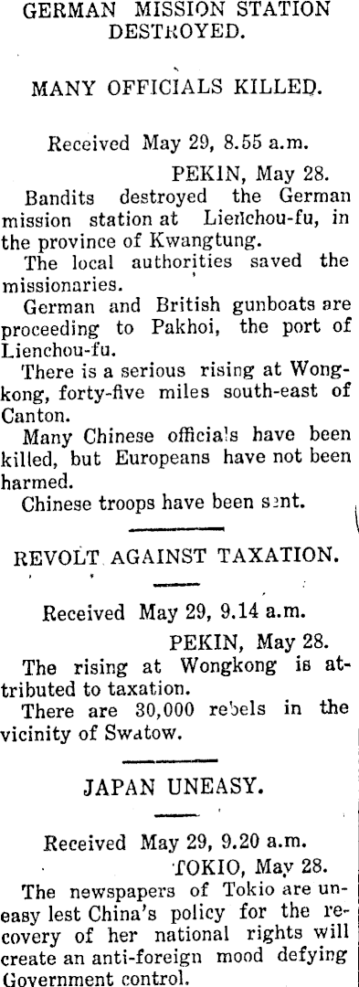 GERMAN MISSION STATION DESTROYED. MANY OFFICIALS KILLED,. Received May 29, 8.55 a.m. PEKIN, May 28. Bandits destroyed the German mission station at Lieilchou-fu, in the province of Kwangtung. The local authorities saved the missionaries. German and British gunboats are proceeding to Pakhoi, the port of Lienchou-fu. There is a serious rising at Wongkong, forty-five miles south-east of Canton. Many Chinese officials have been killed, but Europeans have not been harmed. Chinese troops have been sant. REVOLT AGAINST TAXATION. Received May 29, 9.14 a.m. PEKIN, May 28. The rising at Wongkong is at- , tributed to taxation. There are 30,000 rebels in the vicinity of Swatow. JAPAN UNEASY. Received May 29, 9.20 a.m. TOKIO, May 28. The newspapers of Tokio are uneasy lest China's policy for the recovery of her national rights will create an anti-foreign mood defying Government control.