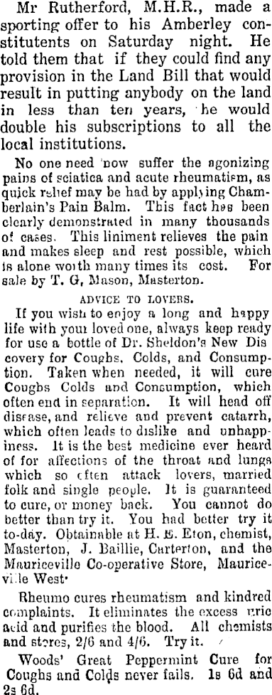 Mr Rutherford, M.H.R., made a sporting: offer to his Amberley constitutents on Saturday night. He told them that if they could find any provision in the Land Bill that would result in putting anybody on the land in less than ten years, he would double his subscriptions to all the local institutions. No one need now suffer the agonizing pains of sciatica and acute rheumatism, as quick relief may be had by appl>ing Chamberlain's Pain Balm. This fact h»s been clearly demonstrated in many thousands o! cases. This liniment relieves the pain and makes sleep and rest possible, which is alone woith many times its cost. For sale by T. G, Mason, Mastertop. ADVICE TO LOVERS. If you wish to enjoy a long and happy life wilh yom loved one, always keep ready for use a bottle of Dr. Sheldon's New Dis covery for Coupbs. Colds, and Consumption. Taken when needed, it will cure Cougbs Colds and CoriGumption, which often end in separation. It will head off disease, and relieve and prevent catarrh, which often leads to dislike and unhappiness. It is the best medicine ever heard of for affections of the throat and lungs which so cften attack lovers, married folk and single peoyle. ]t i 3 guaranteed to cure, or money back. You cannot do better than try it. You had better try it to-day. Obtainable at H. Jffi. Eton, chemist, Mastertonj J. Baillie, Carterton, and the Mauricevillo Co-operative Store, Mauriceviile West* Rheurno cures rheumatism and kindred complaints. It eliminates the excess uric acid and purifies the blood. All chsmists and stores, 2/6 and 4/6. Try it. / Woods' Great Peppermint Cure for Coughs and Colds never fails. Is 6d and 2s 6d.