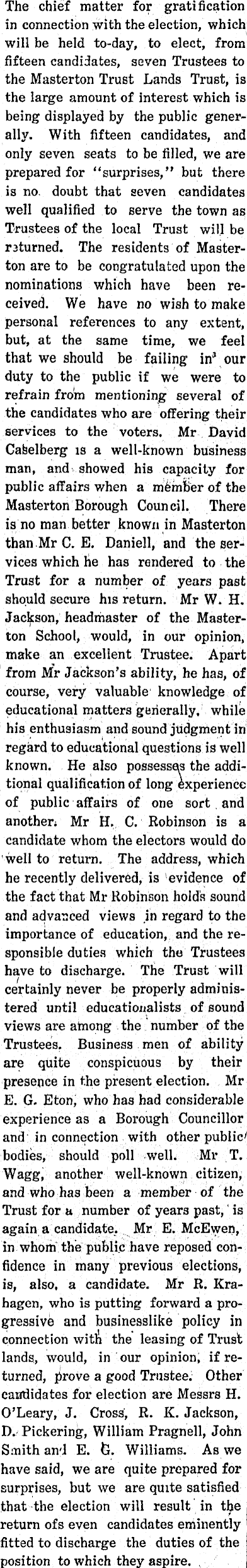 The chief matter for gratification in connection with the election, which will be held to-day, to elect, from fifteen candidates, seven Trustees to the Masterton Trust Lands Trust, is the large amount of interest which is being displayed by the public generally. With fifteen candidates, and only seven seats to be filled, we are prepared for "surprises," but there is no. doubt that seven candidates well qualified to serve the town as Trustees of the local Trust will be raturned. The residents of Masterton are to be congratulated upon the nominations which have been received. We have no wish to make personal references to any extent, but, at the same time, we feel that we should be failing in* our duty to the public if we were to refrain from mentioning several of the candidates who are offering their services to the voters. Mr. David Caselberg is a well-known business man, and showed his capacity for public affairs when a member of the Masterton Borough Council. There is no man better known in Masterton than Mr C. E. Daniell, and the services which he has rendered to the Trust for a number of years past should secure his return. Mr W. H. Jackson, headmaster of the Masterton School, would, in our opinion, make an excellent Trustee. Apart from Mr Jackson's ability, he has, of course, very valuable knowledge of educational matters generally, while his enthusiasm and sound judgment in regard to educational questions is well known. He also possesses the additional qualification of long experience of public affairs of one sort, and another* Mr H., C. Robinson is a candidate whom the electors would do well to return. The address, which he recently delivered, is evidence of the fact that Mr Robinson hold's sound and advanced views in regard to the importance of education, and the responsible duties which the Trustees have to discharge. The Trust will certainly never be properly administered until educationalists of sound : views are among the number of the Trustees. Business men of ability are quite conspicuous by their presence in the present election. Mr E. G. Eton, who has had considerable experience as a Borough Councillor and in connection with other public' bodies, should poll well. Mr T. Wagg, another well-known citizen, and who has been a member of the Trust for a number of years past,' is again a candidate. Mr E. McEwen, in whom the public have reposed confidence in many previous elections, is, also, a candidate. Mr R. Krahagen, who is putting forward a progressive and businesslike policy in connection with the leasing of Trust lands, would, in our opinion; if returned, a good Trustee. Other candidates for election are Messrs H. O'Leary, J. Cross, R. K. Jackson, D.. Pickering, William Pragnell, John Smith and E. G. Williams. As we have said, we are quite prepared for surprises, but we are quite satisfied that the election will result in the return ofs even candidates eminently fitted to discharge the duties of the position to which they aspire. ,