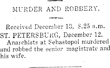 MURDER AND ROBBERY. Received December 13, 8.25 a.m. ST. PETERSBURG, December 12. Anarchists at Sehastopol murdered and robbed the senior magistrate and his wife.