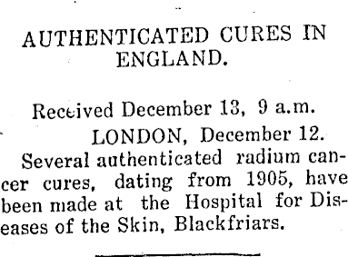 AUTHENTICATED CURES IN ENGLAND. Received December 13, 9 a.m. LONDON, December 12. Several authenticated radium cancer cures, dating from 1905, have been made at the Hospital for Diseases of the Skin, Blackfriars.