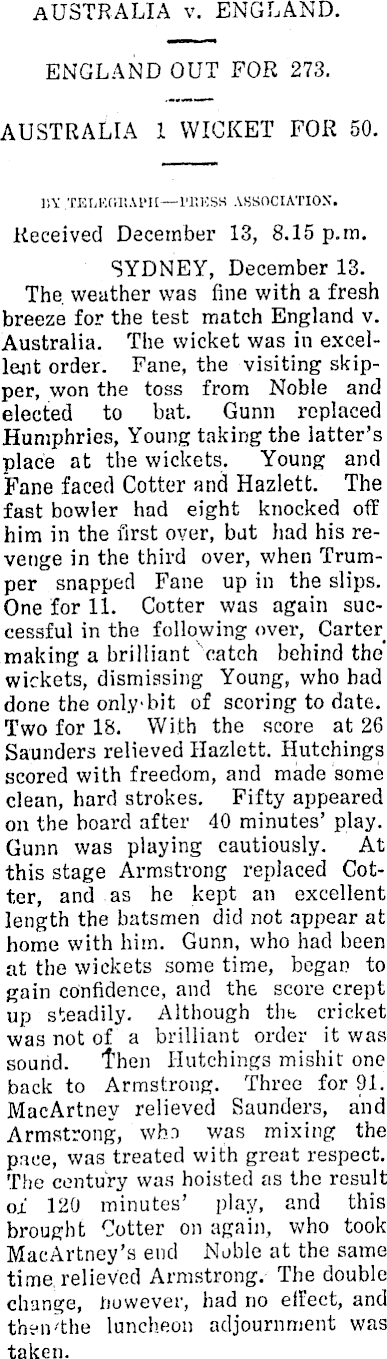 AUSTRALIA v. ENGLAND. ENGLAND OUT FOR 273. AUSTRALIA 1 WICKET FOR 50. BY .TETiKOIiAI'U—IT.KSH ASSOCIATION. Received December 13, 8.15 p.m. SYDNEY, December 13. The. weather was fine with a fresh breeze for the test match England v. Australia. The wicket was in excellent order. Fane, the visiting skipper, won the toss from Noble and elected to bat. Gunn replaced Humphries, Young taking the latter's place at the wickets. Young and Fane faced Cotter and Hazlett. The fast bowler had eight knocked off him in the first over, bat had his revenge in the third over, when Trumper snapped Fane up in the slips. One for 11. Cotter was again successful in the following over, Carter making a brilliant 'catch behind the' wickets, dismissing Young, who bad done the only-bit of scoring to date. Two for 18. With the score at 26 Saunders relieved Hazlett. Hutchings scored with freedom, and made some clean, hard strokes. Fifty appeared on the board after 40 minutes' play. Gunn was playing cautiously. At this stage Armstrong replaced Cotter, and as he kept an excellent length the batsmen did not appear at home with him. Gunn, who had been at the wickets some time, began to gain confidence, and the score crept up steadily. Although tht cricket was not of a brilliant order it was sound. Then Hutchings mishit one back to Armstrong. Three for 91. MacArtney relieved Saunders, and Armstrong, whs was mixing the pace, was treated with great respect. The century was hoisted as the result of 120 minutes' play, and this brought Cotter on again, who took MacArtney's end Noble at the same time, relieved Armstrong. The double change, huwever, had no effect, and then'the luncheon adjournment was taken.