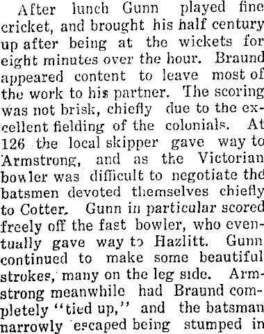 After lunch Gunn played fine cricket, and brought his half century up after being at the wickets for eight minutes over the hour. Braund appeared content to leave most of the work to his partner. The scoring was not brisk, chiefly due to the excellent fielding of the colonials. At 126 the local skipper gave way to Armstrong, and as the Victorian bowler was difficult to negotiate the 1 batsmen devoted themselves chiefly to Cotter, Gunn in particular scored freely off the fast bowler, who eventually gave way to Hazlitt. Gunn continued to make some beautiful strokes, many on the leg side. Armstrong meanwhile had Braund completely "tied up," and the batsman narrowly escaped being stumped in