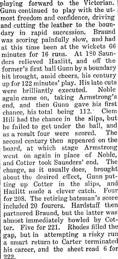 playing forward to the Victorian. Gunn continued to play with the utmost freedom and confidence, driving and cutting the leather to the boundary in rapid succession. Braund was scoring painfully slow, and had at this time been at the wickets 66 minutes for 16 runs. At ISO Saunders relieved Hazlitt, and off the former's first ball Gunn by a boundary hit brought, amid cheers, his century up for 122 minutes' play. His late cuts were brilliantly executed. Noble again came on, taking Armstrong's end, and then Gunn gave his first chance, his total being 112.' Clem Hill had the chance in the slips, but he failed to get under the ball, and as a result four were scored. The second century then appeared on the board, at which stage Armstrong went on again in place of Noble, and Cotter took Saunders' end. The change, as it usually does, brought about the desired effect, Gunn putting up Cotter in the slips, and Hazlitt made a clever catch. Four for 208. The retiring batsman's score included 20 fourers. Hardstaff then partnered Braund, but the latter was almost immediately bowled by Cotter. Five for 221. Rhodes filled the gap, but in attempting a risky run a smart return to Carter terminated his career, and the sheet read 6 for 222.