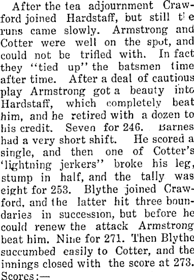 After the tea adjournment Crawford joined Hardstaff, but still tie runs came slowly. Armstrong and Cotter were well on the spot, and could not be trifled with. In fact they "tied up" the batsmen time after time. After a deal of cautious play Armstrong got a beauty into Hardstaff, which completely beat him, and he retired with a dozen to his credit. Seven for 246. tfarnes had a very short shift. He scored a single, and then one of Cotter's 'lightning jerkers" broke his leg, stump in half, and the tally was eight for 253. Blythe joined Crawford, and the latter hit three boundaries in succession, but before he could renew the attack Armstrong beat him. Nine for 271. Then Blythe succumbed easily to Cotter, and the innings closed with the score at 273. Scores :